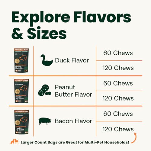 VetriScience® GlycoFlex® 3 Extra Strength Healthy Hip & Joint Chews represent Stage 3 of our comprehensive joint health program, formulated for dogs needing advanced support. This formula is recommended by veterinarians for geriatric dogs, working breeds, and as follow-up care after orthopedic surgery. Clinical research shows GlycoFlex 3 can increase hind-leg strength by up to 41% in just 4 weeks, making it one of the most trusted solutions for canine joint care. Each two-chew serving delivers 10 powerful active ingredients: 1000 mg glucosamine HCl (shrimp & crab), 1000 mg MSM, 600 mg GlycOmega™ brand Perna canaliculus (green-lipped mussel), 100 mg DMG, 50 IU Vitamin E, 24 mg Vitamin C, 10 mg manganese, 5 mg grape seed extract, 2 mg L-glutathione, and 0.002 mg selenium. Together, they support cartilage resilience, connective tissue strength, joint lubrication, collagen production, and oxidative balance. Unlike mussel powders or extracts, GlycOmega™ Perna utilizes the entire organism, preserving natural fatty acids and bioactives for superior results. Antioxidants (C, E, grape seed extract, selenium, glutathione) further promote immune health, detoxification, and a healthy inflammatory response. These bite-sized chicken-liver flavored chews are highly palatable, turning daily dosing into treat time. Manufactured in the USA in an FDA-registered, SQF-certified facility and carrying the NASC seal, GlycoFlex 3 guarantees clean, safe, and effective joint support with no artificial colors or fillers. Feeding directions are simple: initial 4–6 weeks: up to 30 lbs = 1 chew daily; 31–60 lbs = 2 chews daily; 61–100 lbs = 4 chews daily; 101+ lbs = 5 chews daily. Maintenance: reduce to 1 chew every other day for smaller dogs, or 1–3 chews daily depending on weight. With over 40 years of VetriScience expertise and 15,000+ veterinarians recommending our products, GlycoFlex 3 delivers clinically proven, veterinarian-trusted results—keeping your dog comfortable, mobile, and active year-round.