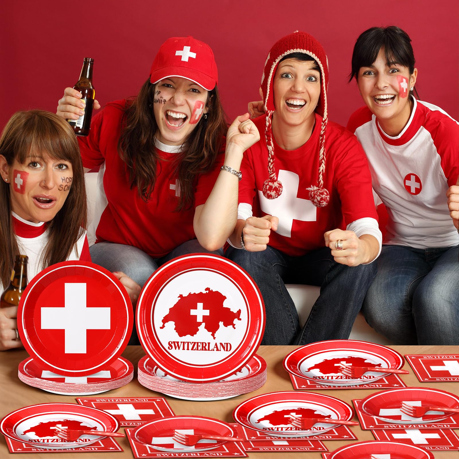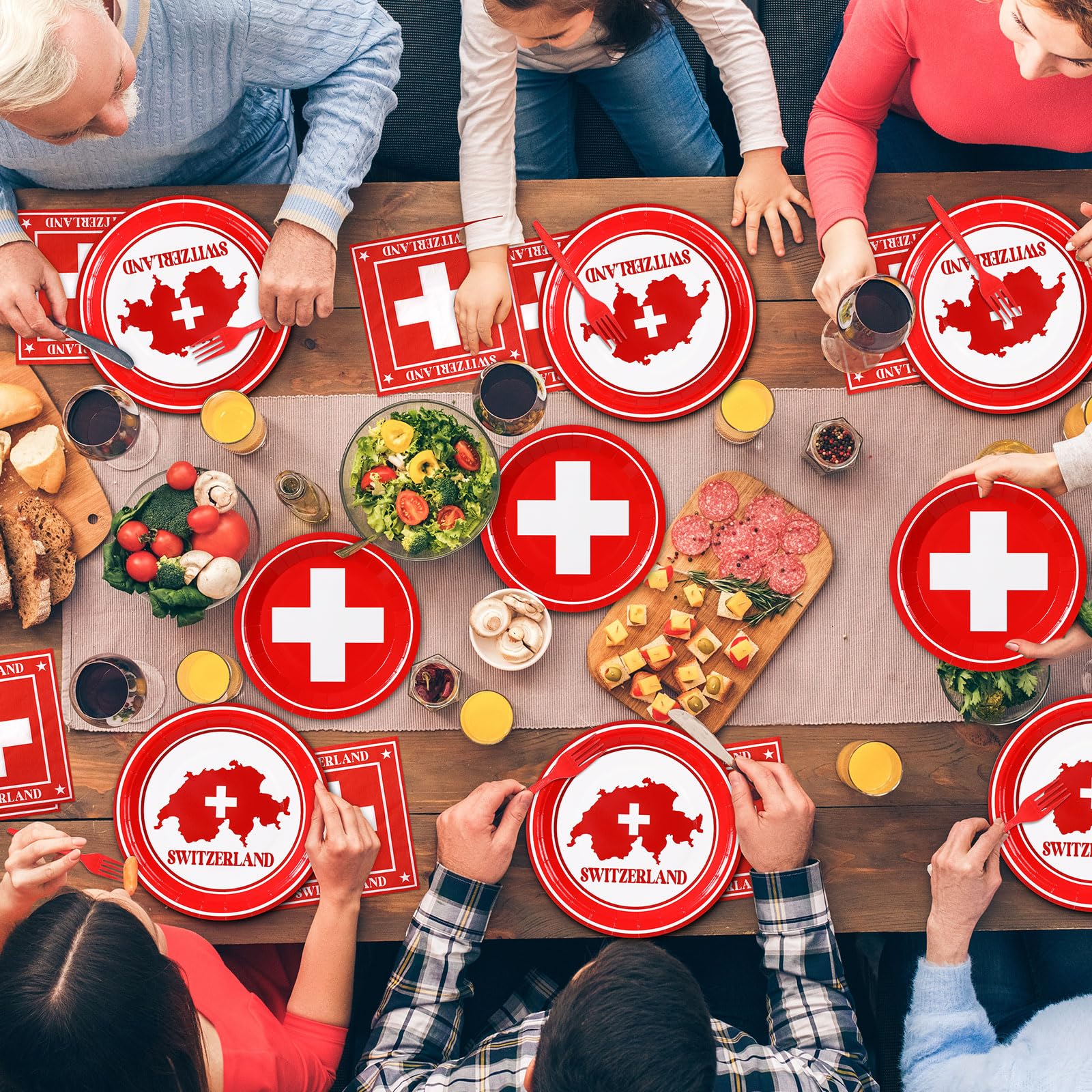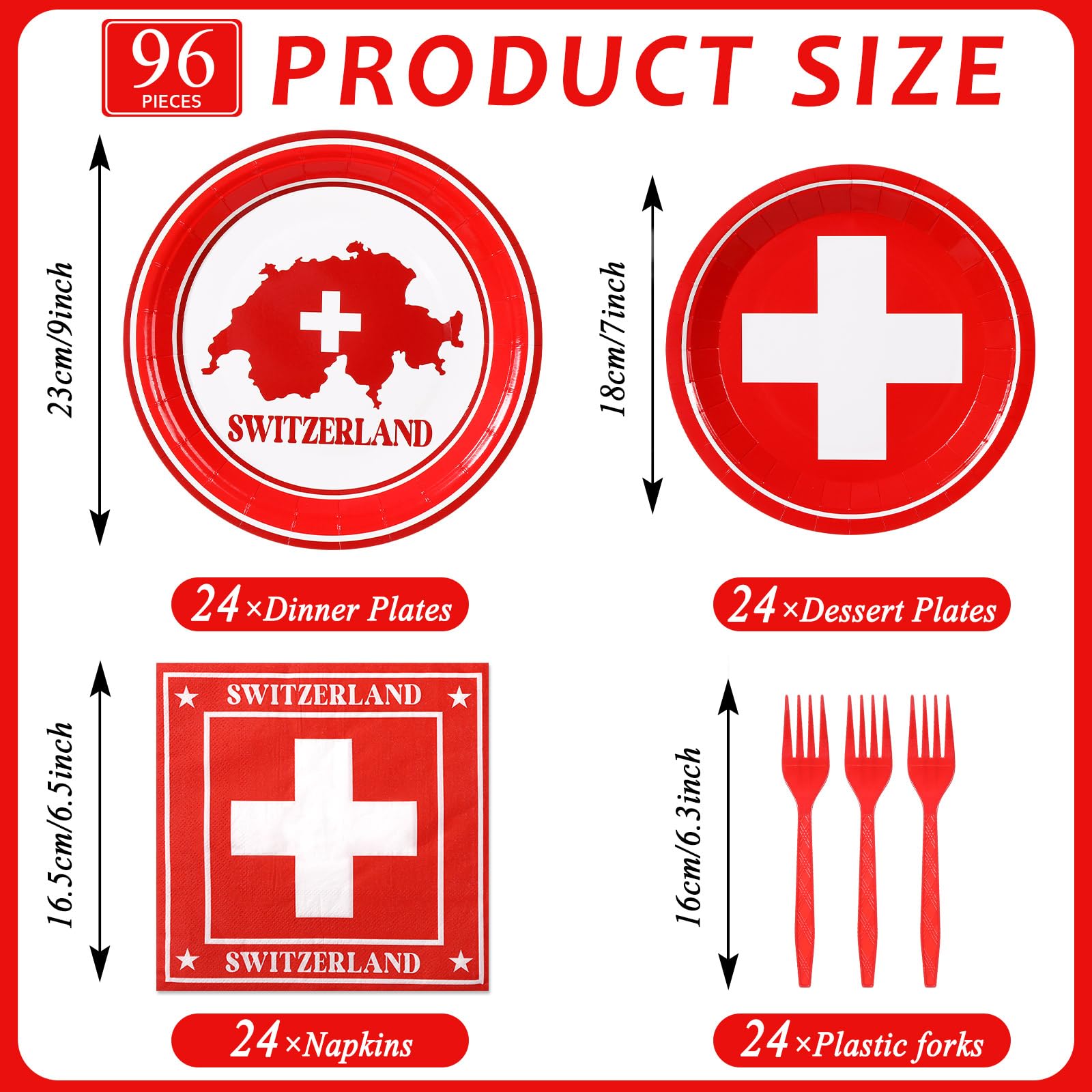 Package Include: Swiss-themed party supplies includes24 9-inch Swiss themed party plates styled after the national flag; 24 7-inch Swiss plates with a red and white Swiss silhouette design; 24 double-layer Switzerland napkins and 24 matching red forks (total 96pcs); ideal for Swiss National Day, European cultural events, or red-and-white themed gatherings