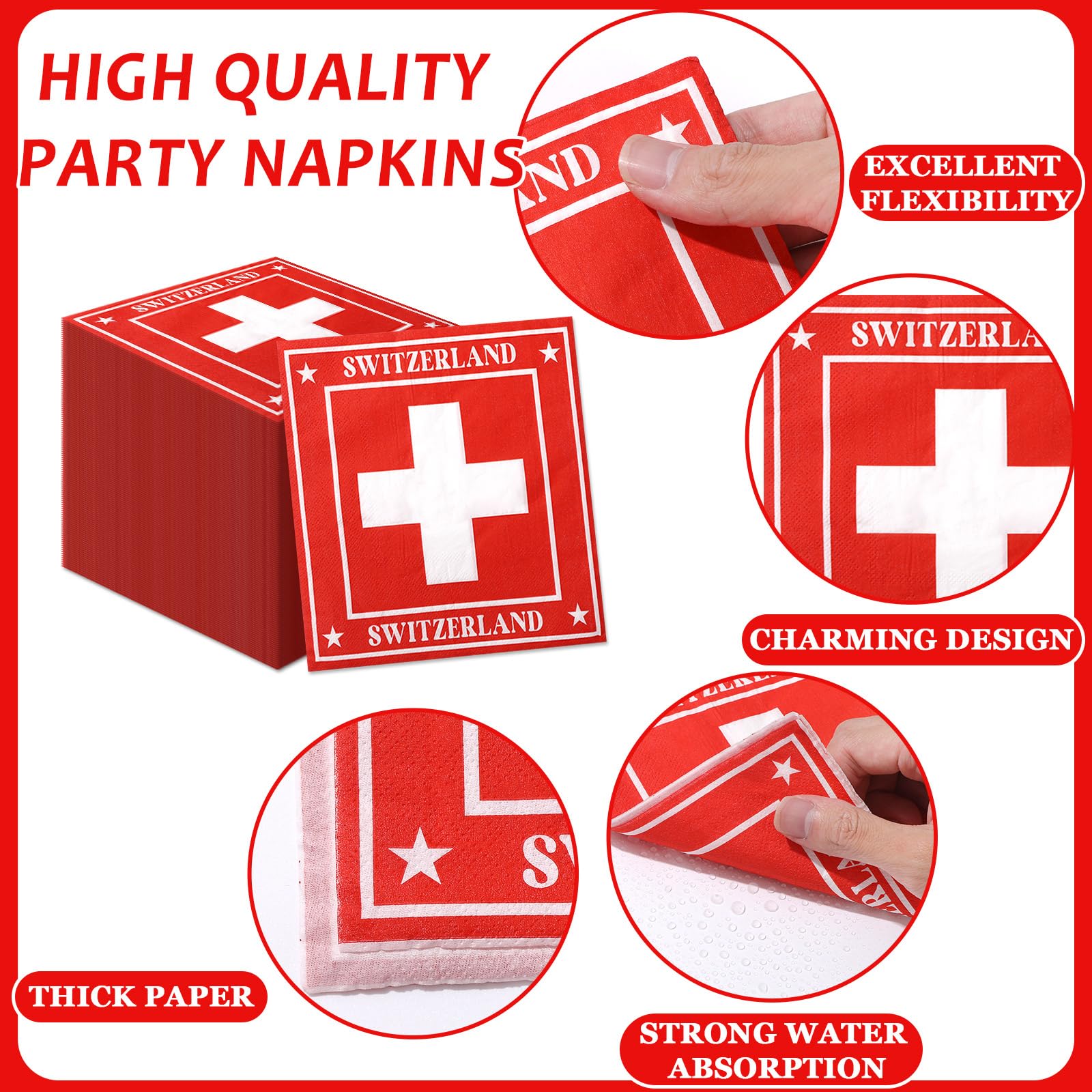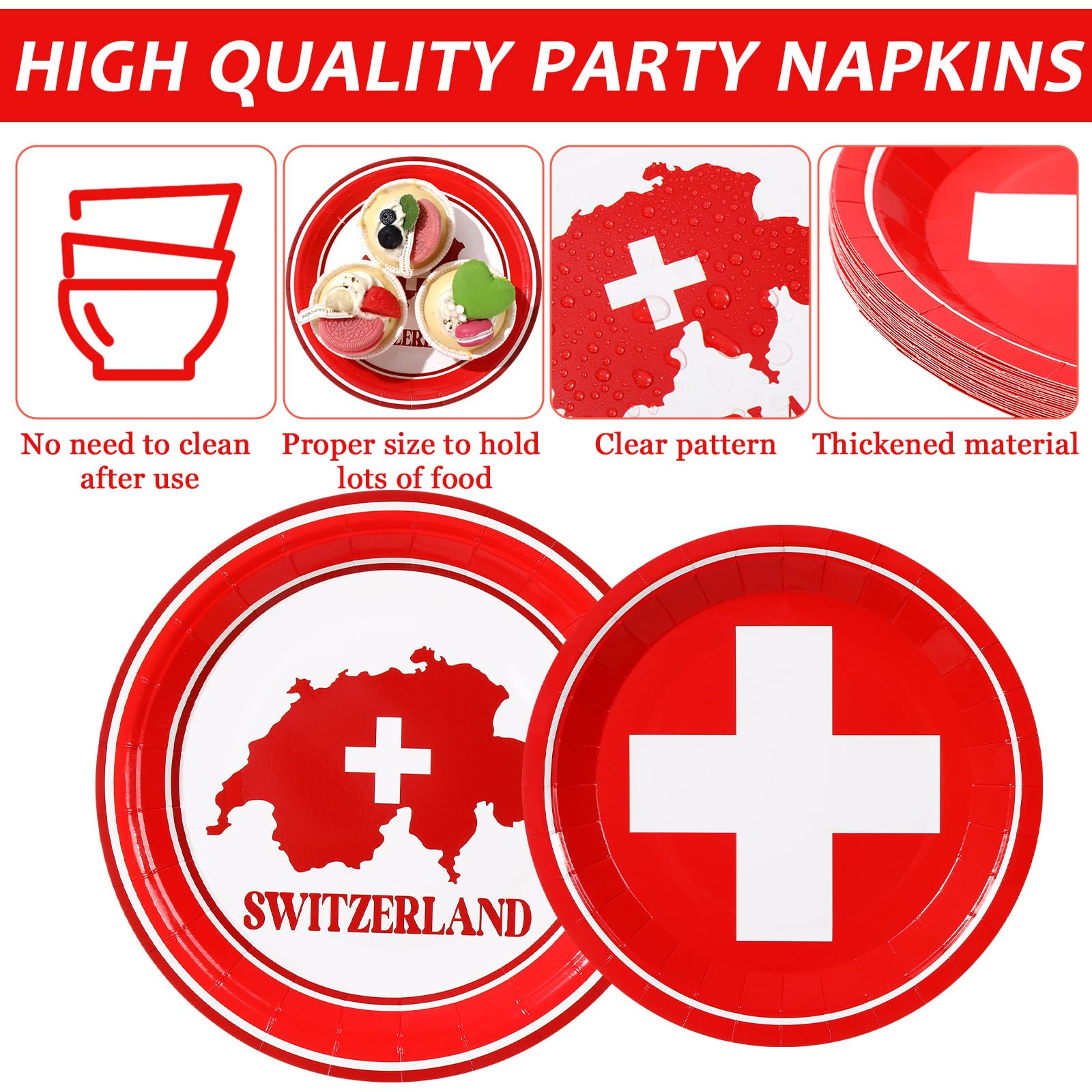 Distinctive national look: Switzerland party supplies boast an authentic national style—7-inch plates highlight a subtle Swiss silhouette with “Switzerland” text, while9-inch plates mimic the iconic Swiss flag (red background + centered white cross); these designs instantly bring genuine Swiss festive vibes to your party table, impressing guests at first glance
