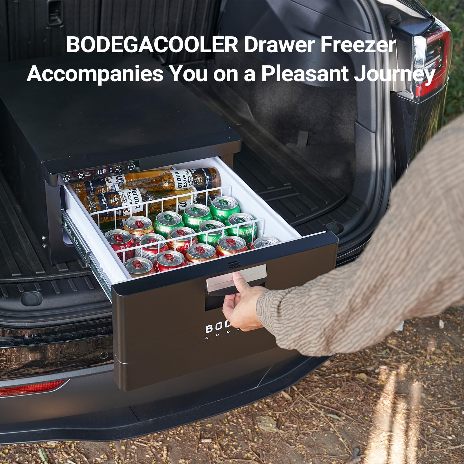Efficient Cooling System: BODEGACOOLER 12v Drawer Refrigerator combines a 33QT large capacity with an advanced compressor system and rapid cooling technology. This portable refrigerator supports APP remote control and includes Max and Eco modes, enabling quick temperature adjustments from -4℉ to 68℉, ensuring optimal temperature management for all your drinks and perishables