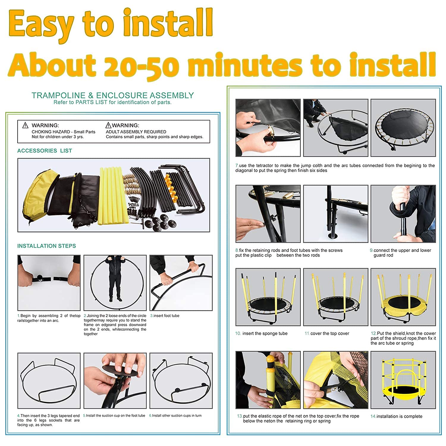 PACKAGE CONTAINS - One trampoline, safety net, springs cover pad, jump pad, rust-proof steel pipe, pull tool (T-Hook), trampoline basketball hoop, 6pcs large suction cups, 10pcs pit ball, trampoline accessories and all the installation tools you need.