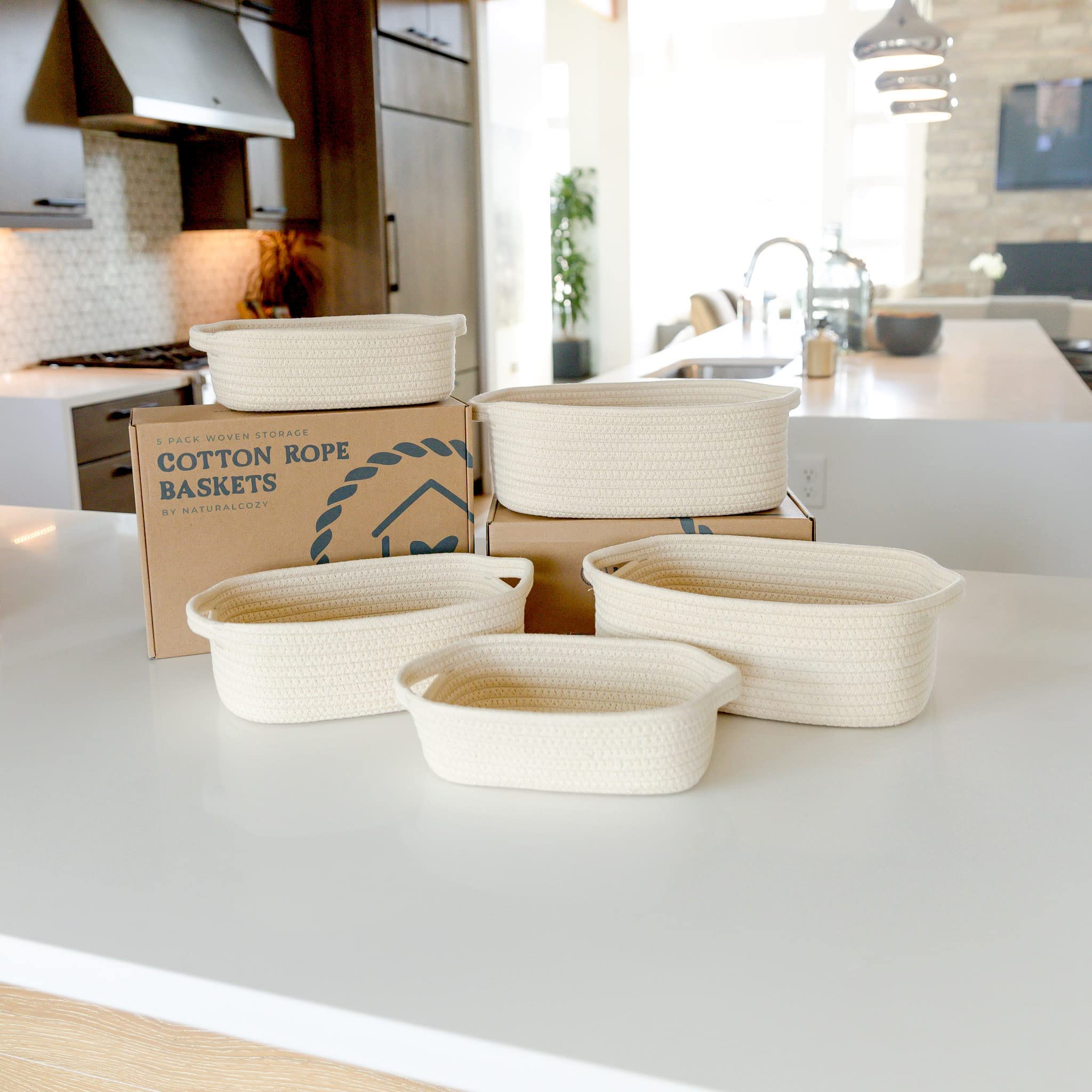 5 BASKETS FOR 5X THE ORGANIZING POWER: Life is messy...but your house doesn’t have to be! With 5 beautiful rope baskets for organizing, you’ll defeat messy rooms like a true supermom! Use the largest baskets for Montessori displays or countertop fruits holder, create the cutest dog toy storage or bathroom hand towel holder with the medium ones and stash jewelry or keys in the smallest. Biggest (11.8"x8.7"x4.3"), (11"x7.9"x3.9"), (10.2"x7.1"x3.5"), (9.1"x6.3"x3.1"), Smallest (7.9x5.5"x2.8")