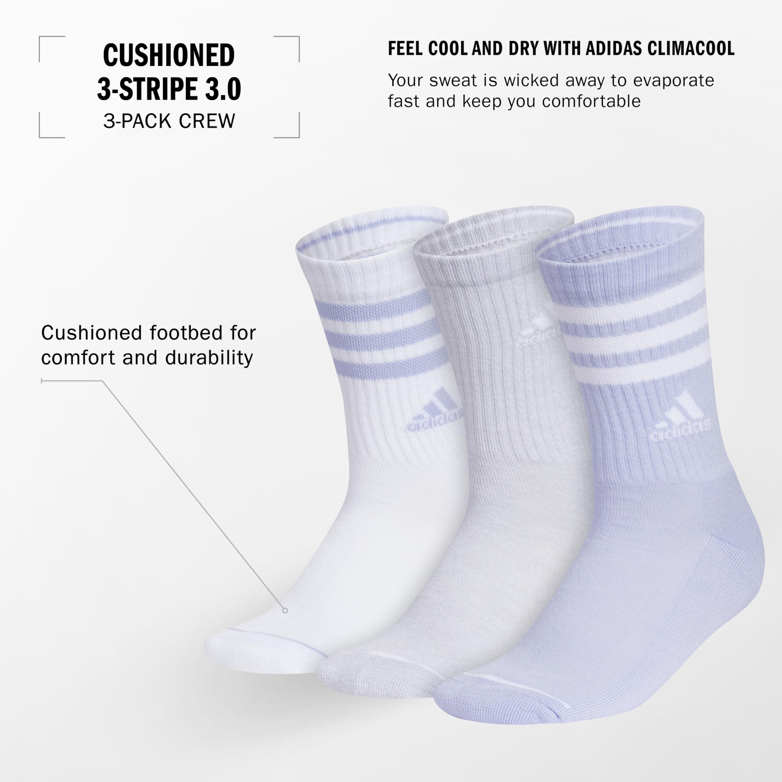 Description From fitness class to coffee run, these crew-length adidas socks keep you in action. Stylish yet sweat-wicking, they help feet stay dry, reducing the chance of chafing. The cushioned footbed adds an extra layer of comfort when you up the pace. Suitable as gym socks women, these athletic socks provide great support. Available in various styles, these women's socks cater to different preferences.