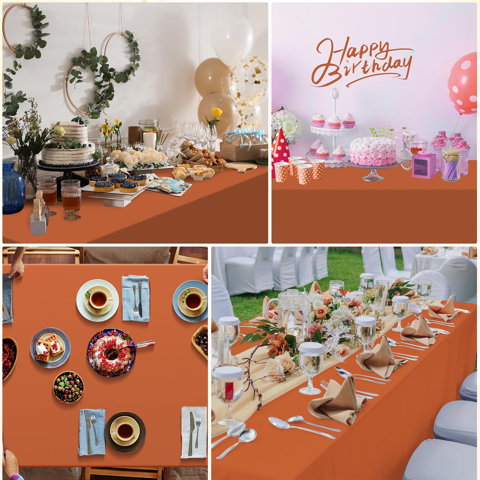 Solid Colors: as you can see in the pictures,our orange tablecloths are solid colors,simple and classic,bright and attractive,presenting a pleasant visual effect,which could bring you an unforgettable party experience and create a strong atmosphere.