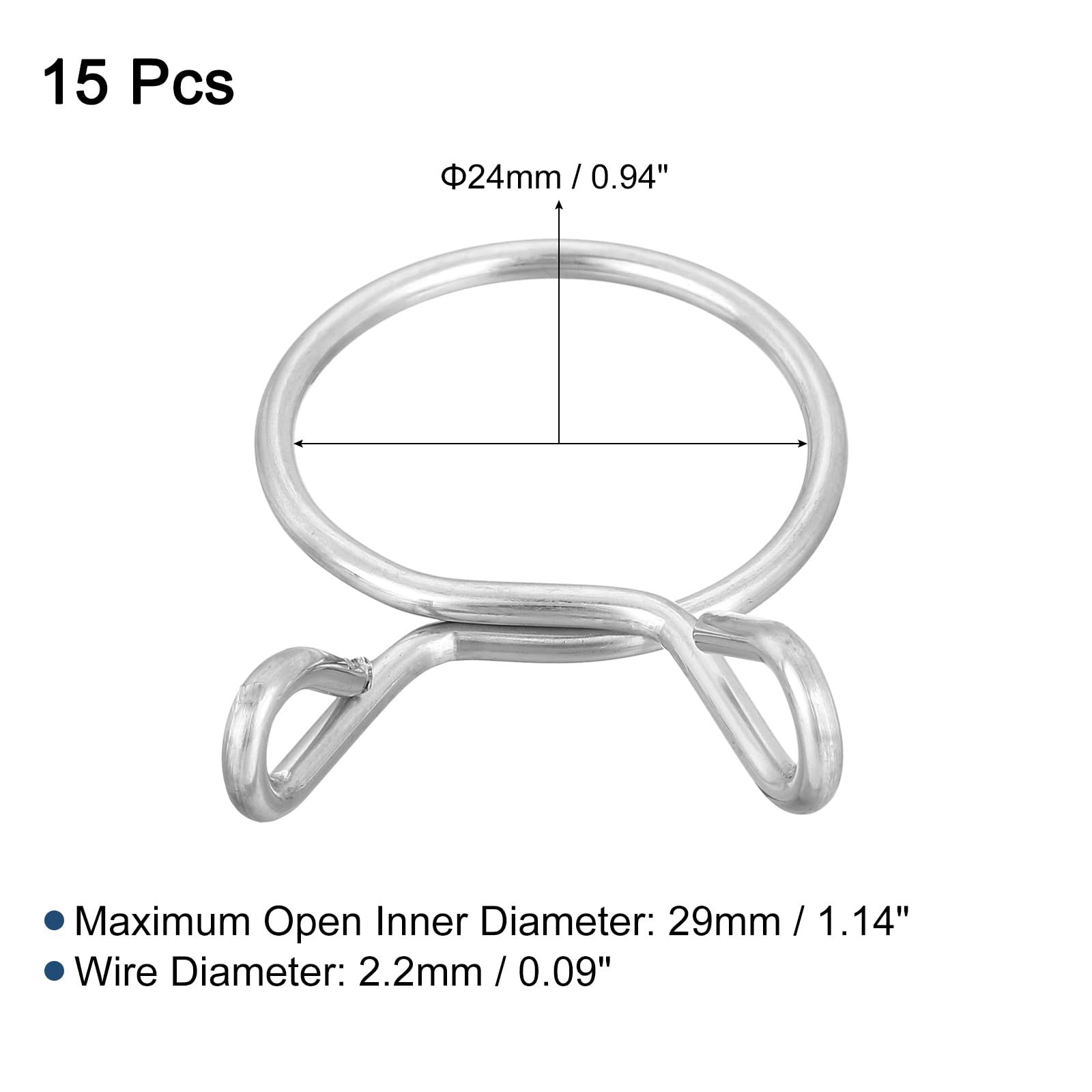 Package and Size: Material: 304 Stainless Steel, Maximum Open Inner Diameter: 29mm / 1.14inch, Inner Diameter: 24mm / 0.94inch, Wire Diameter: 2.2mm / 0.09inch, Package Content: 15 Pcs Fuel Line Hose Clips