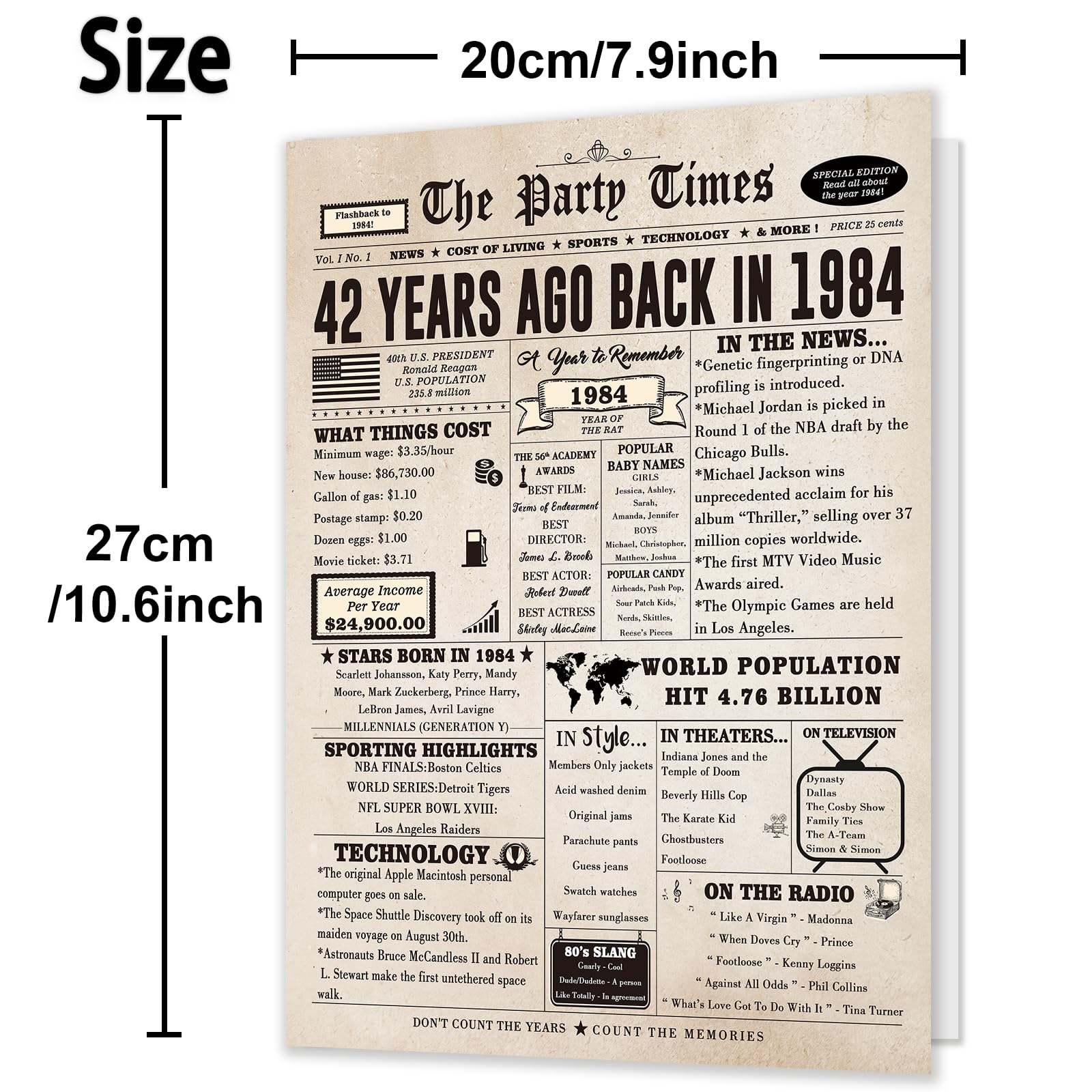 It's more than just a card; it's a cherished keepsake and a testament to the joy of celebrating life's milestones! When it comes to celebrating a remarkable 42 years of life, 42nd birthday card is the ultimate tribute to a journey well-lived. Whether you're celebrating your best friend, parents, siblings, or spouse, this card is the perfect gift that encapsulates a lifetime of memories. Perfect option to recognize a milestone birthday. Size is large enough to easily read all the interesting fun facts. Plenty of room inside to personalize, well wishes/messages. Great option when you want a little more than a typical birthday card. Funny card with lots of good facts about the year you choose eg: median house prices, incomes, gasoline, historical events, movies, ect many of the events depicted on the card. The size was great to pass around for all to read, and made it handy to insert my own text.