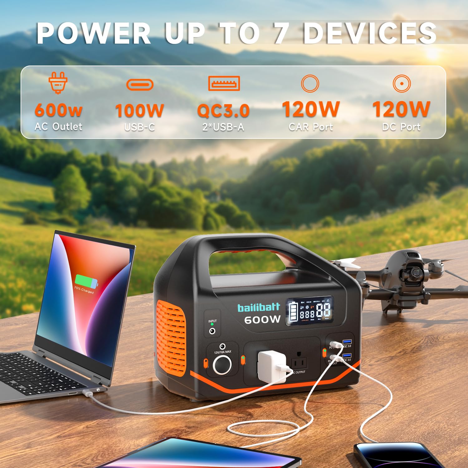 Versatile Power Supply - With 7 output ports including 1* 600W/120V AC outlet, 1* PD 100W USB-C port , 1* PD 24W USB-C port, 2* fast charge 3.0 port, 1* Car Port and 1* DC port. this bailibatt 600w power station efficiently charge many device such as laptops, drones, cameras, and etc.