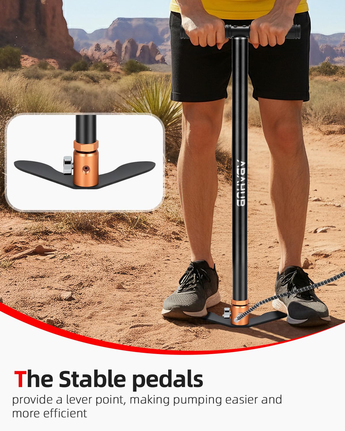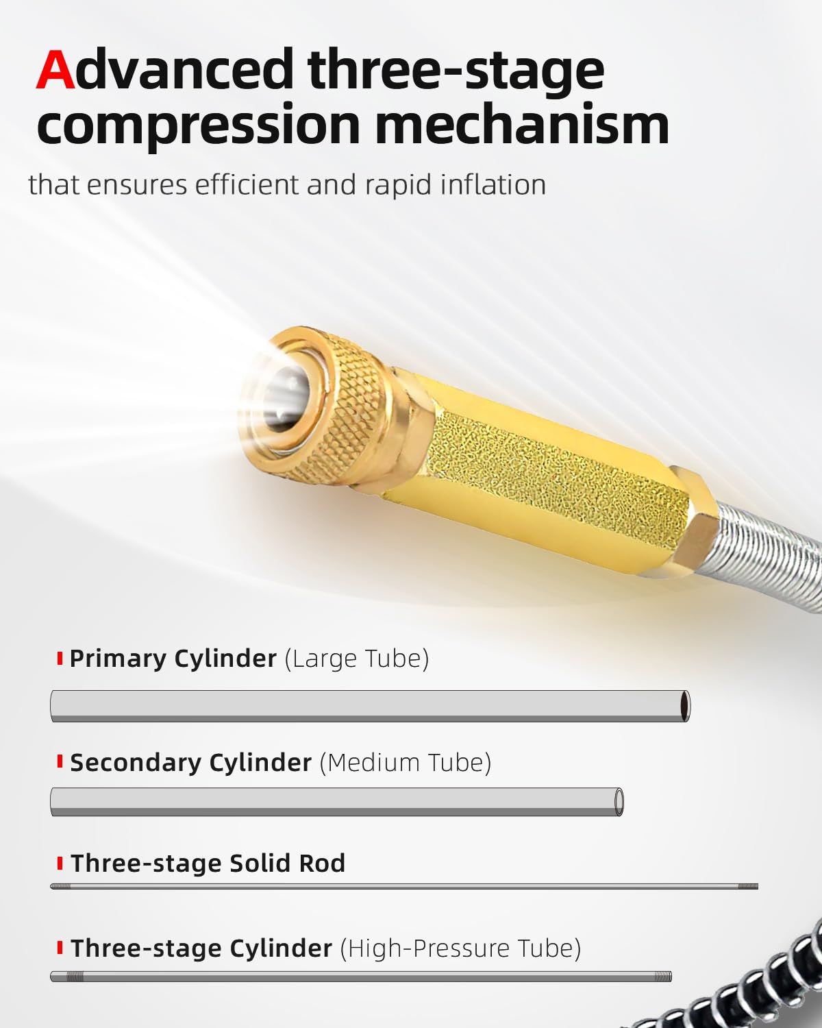 Durable Three-Stage Compression System: Features an advanced three-stage compression mechanism that ensures efficient and rapid inflation, significantly reducing pumping effort and time compared to standard pumps.