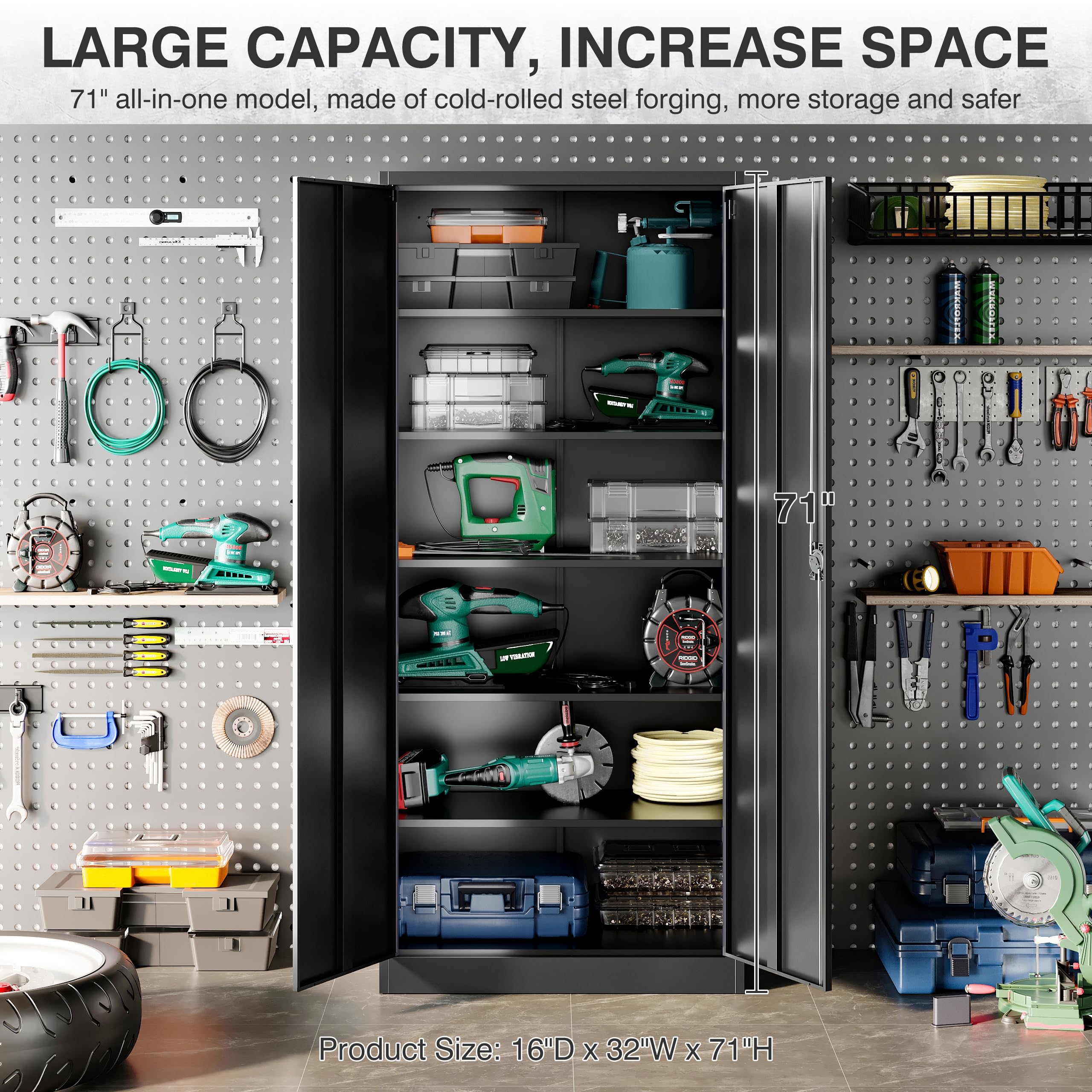 Upgraded 5pcs Adjustable Shelf : The garage cabinets storage uses 5 adjustable shelves. You can move to the desired height by adjusting the shelf pegs according to the size of the things. so that you can divide the office storage cabinet space distribution. You can also design garage storage flexibly and remove the shelves for more standing room