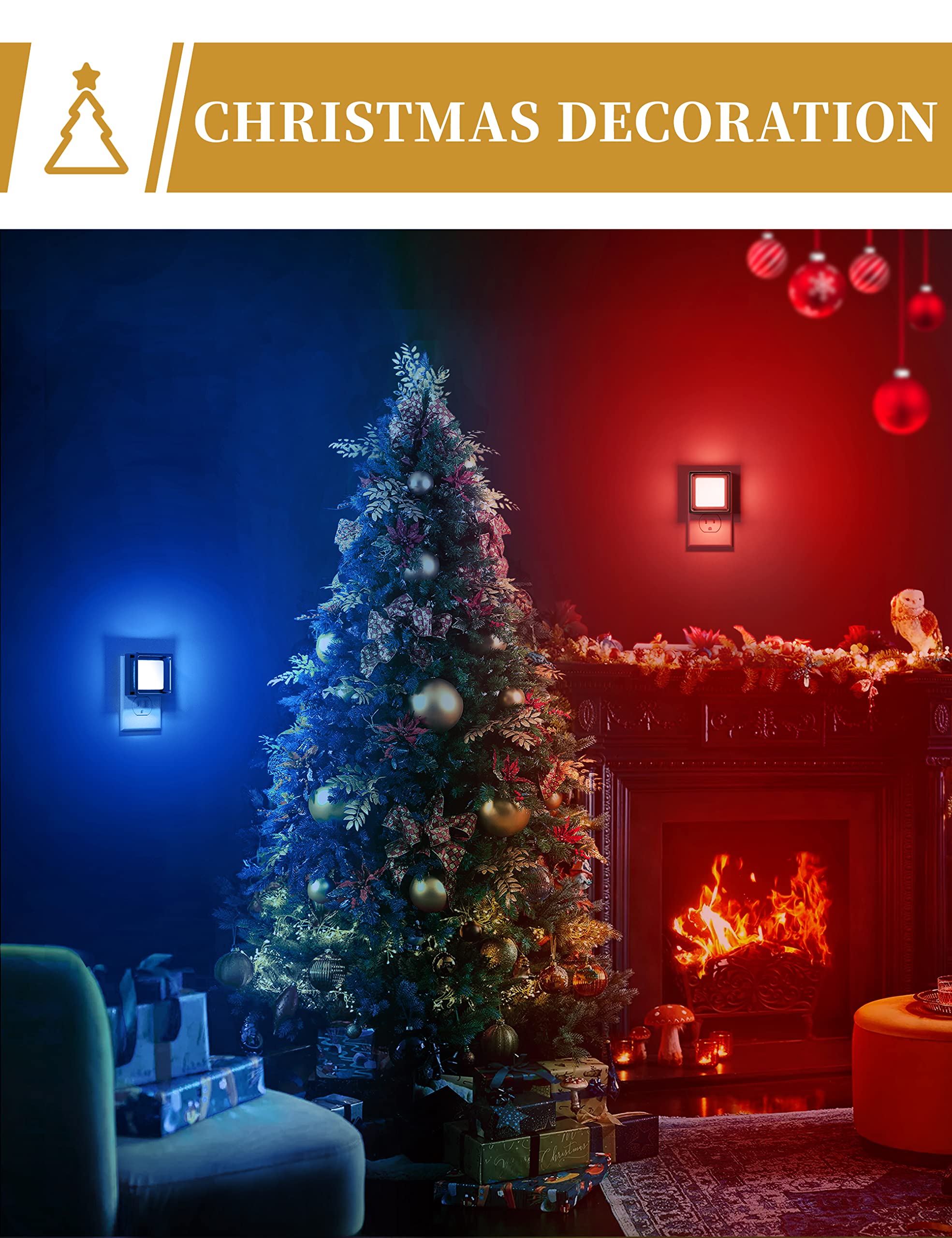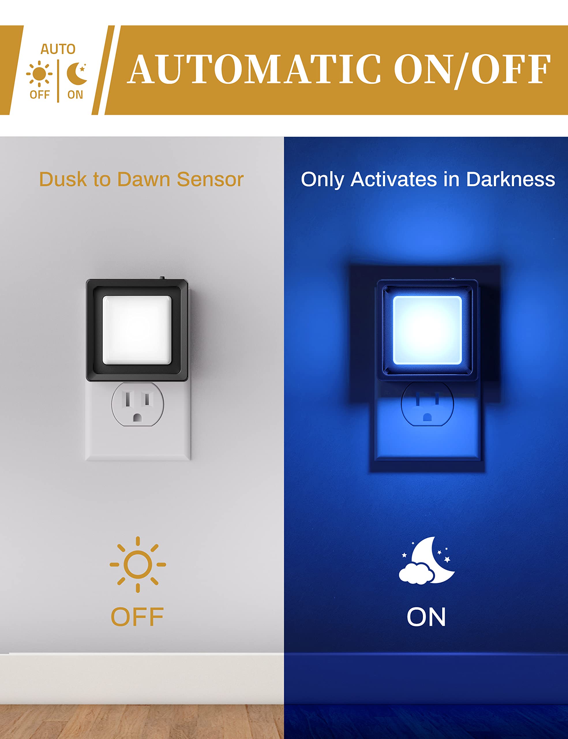NIGHTLIGHTS WITH LIGHT SENSORS: The decorative night light with special smart light sensor chip will detect the luminance of surrounding environment, make night light turn on automatically at night and turn off in the daytime. Do not need to switch night lite on manually.