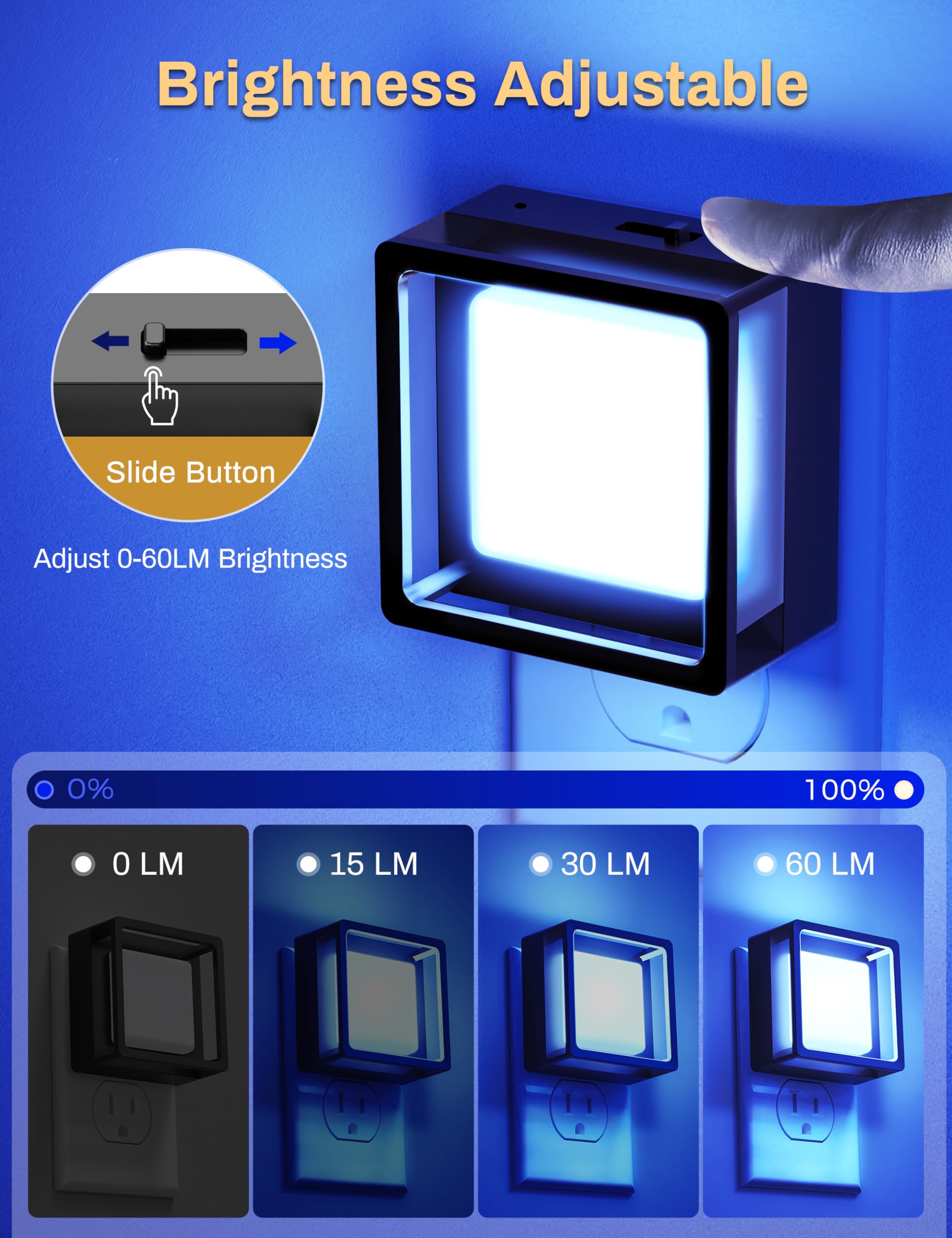 BRIGHTNESS ADJUSTABLE: This dimmable plug in night light are brightness adjustable from 0lm to 60lm with a slide switch. You can choose the brightness you want to cater to your different usage scenarios.