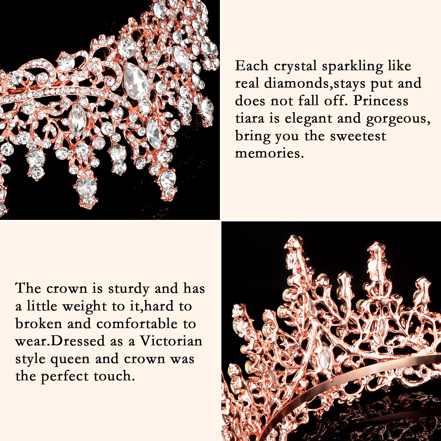 Design: The hair accessories are well-made and have a certain weight, but they do not affect the wear. The comb design on both sides allows the crown to stay well on the head for long-lasting beauty, and it doesn't mess up the hairstyle, even for updo and curly hair.