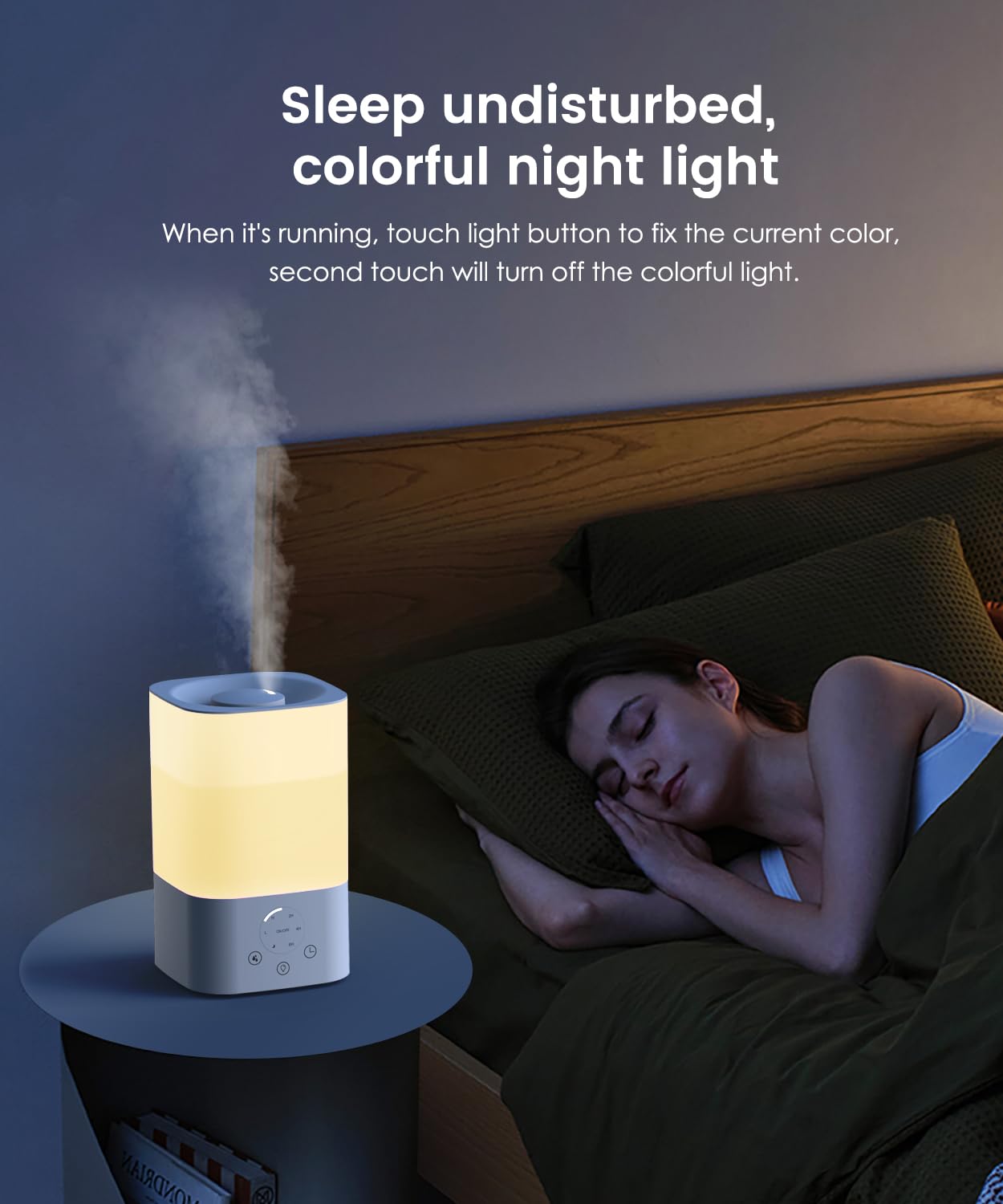 Long-Lasting Moisture: With a large 3.5L water tank, this cool mist humidifier can provide continuous moisture output of 180ml per hour, ensuring a consistently comfortable and moisturized environment, our home humidifiers meet the needs of the whole day.