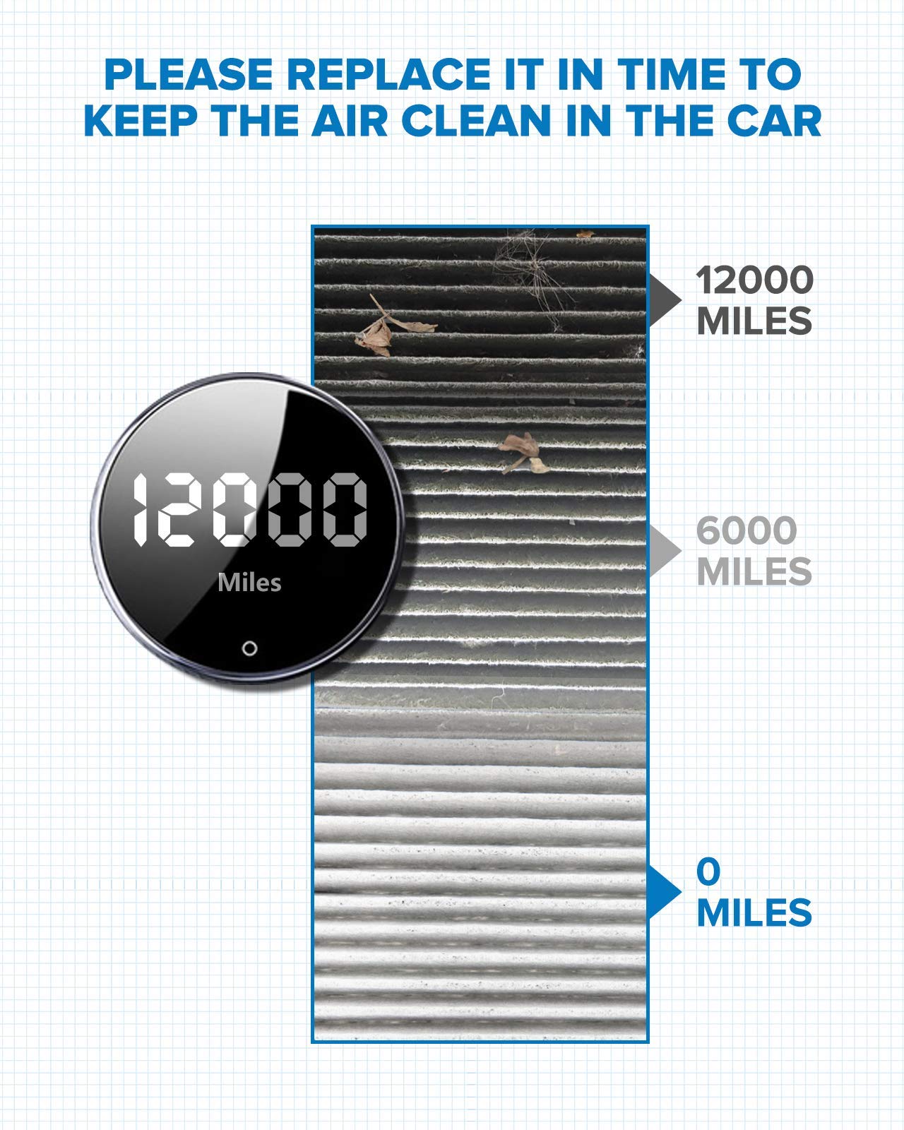 [Suggestion for Replacement]:Replace every 12 months or when it drives to 12, 000 miles. If you often drive in heavily polluted areas and muddy roads, it is recommended that you replace them frequently to keep the air fresh in the car