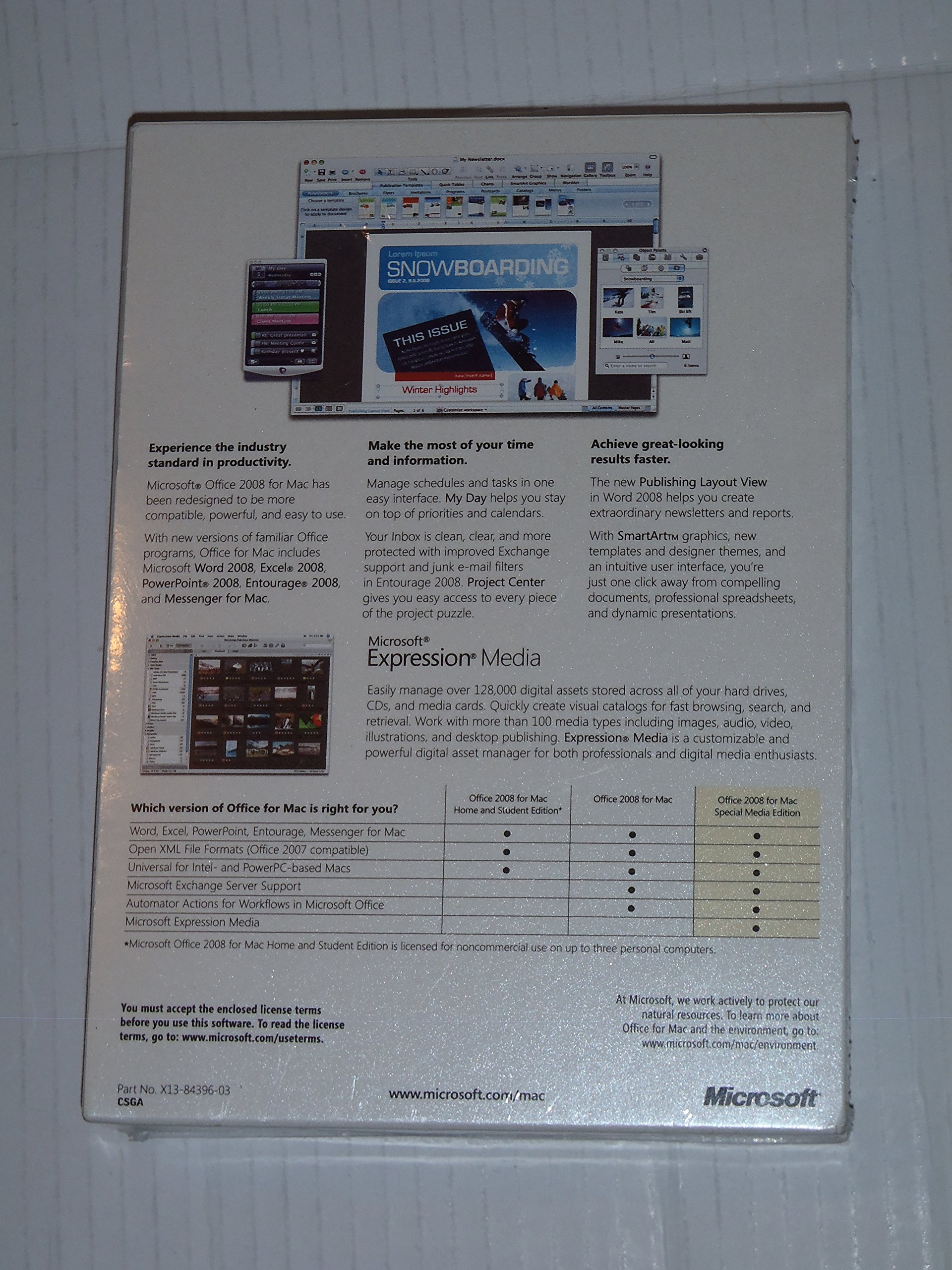 Amazon.com Microsoft Office 2008 for Mac Special Media Edition. The power of the Office 2008 applications plus Expression Media, the powerful asset management tool to visually catalog, organize and present all of your digital assets. Simplify your work and visualize your success. Five Great Reasons to Upgrade to Office 2008 Special Media Edition: Universal Binary Support: Office 2008 Special Media Edition runs natively on both Intel- and PowerPC-based Macs. Streamlined user interface: You'll quickly build professional, complex documents using Word 2008 Document Elements. With a visual gallery of document components in the new user interface, cover pages, tables of contents, and citations are just a click away. Your Mac, more compatible: Office 2008 Special Media Edition and Windows-based 2007 Office products share the Open XML file formats, the OfficeArt graphics engine and other compatibility tools. You'll be confident when sharing ideas and documents with colleagues across platforms. Media-rich documents in minutes: Great design is a click away with hundreds of new templates, SmartArt graphics, Publishing Layout View, and professional quality clip art and photos. Your media, well managed: Drag-and-drop digital asset management, batch conversion and tagging, even built-in archiving and backup capabilities help you manage over 100,000 files and hundreds of format types across multiple storage devices. Expression Media gives you more power to work and manage your digital assets. Which Version of Office 2008 is right for you? View this comparison chart. Simplify Your Work Your presentation will make an impact. Your documents will be professional. Your analysis will be insightful. And Office 2008 will be there. The latest version of the industry standard for productivity software on the Macintosh platform, Microsoft Office 2008 for Mac is more powerful and easier to use. Office 2008 combines Microsoft Word for Mac, Microsoft PowerPoint for Mac, Microsoft Excel for Mac, Microsoft Entourage for Mac, and Microsoft Messenger for Mac and lets you easily create high-impact documents and seamlessly share your ideas with others, whether they are on the Mac or Windows platform. What's New in Office for Mac? Universal versions of the most popular productivity applications on the Macintosh platform (Universal applications run natively on Intel- and PowerPC-based Macs.) Microsoft Office for Mac natively supports the Open XML file formats for compatibility with Windows-based 2007 Microsoft Office products. A redesigned user interface and powerful new tools for simplifying work, creating great looking documents, and exchanging ideas and information with others. Highlights of Office 2008 for Mac Office 2008 is a Universal Binary, was built by Mac users for Mac users, and includes many features which take advantage of underlying technologies of the Macintosh platform. Office 2008 uses Open XML file formats for compatibility with Windows-based 2007 Microsoft Office products. XML file formats help reduce the risk of lost information due to damaged or corrupted files and also result in smaller file sizes--up to 75 percent smaller than comparable binary documents. Office 2008 for Mac is backward-compatible with earlier file formats and users can continue to use the older .doc, .xls, and .ppt binary formats. Elements Gallery is the foundation of the new user interface, and gives easy access to the most commonly used tools and templates. With the new UI, you'll harness the capabilities of Office for Mac more easily than ever before. Office 2008 includes OfficeArt, the powerful graphics engine also used in the Windows-based Office 2007 products. You get great cross-platform file fidelity and easy access to stunning visual and graphic effects. Your words will make an impact with the modern styling of SmartArt graphics, which makes transforming text and bulleted lists into professional diagrams and graphics one-click easy. A new Themes capability simplifies the process of applying a consistent look and feel across documents. Easily apply a complete set of colors, fonts, and effects to your Office 2008 documents, and change them as easily as changing your mind. Automator Actions for Workflows in Microsoft Office enables you to automate Office 2008 with more than 70 pre-defined actions built to simplify your work and extend your productivity. (Available in Office 2008 for Mac and Office 2008 for Mac Special Media Edition.) Entourage 2008, the hub of Office 2008, helps it to happen, one task at a time. Enjoy powerful new tools, over 100 designer templates, rich themes, and an intuitive user interface in Word 2008. Entourage 2008 Your e-mails will spark ideas, you'll schedule meetings where creativity abounds. Entourage 2008, the hub of Office 2008, helps it to happen, one task at a time. My Day keeps you connected to the action. Schedules, tasks, and priorities in one easy, standalone interface. Time will have no choice but to be well-m
