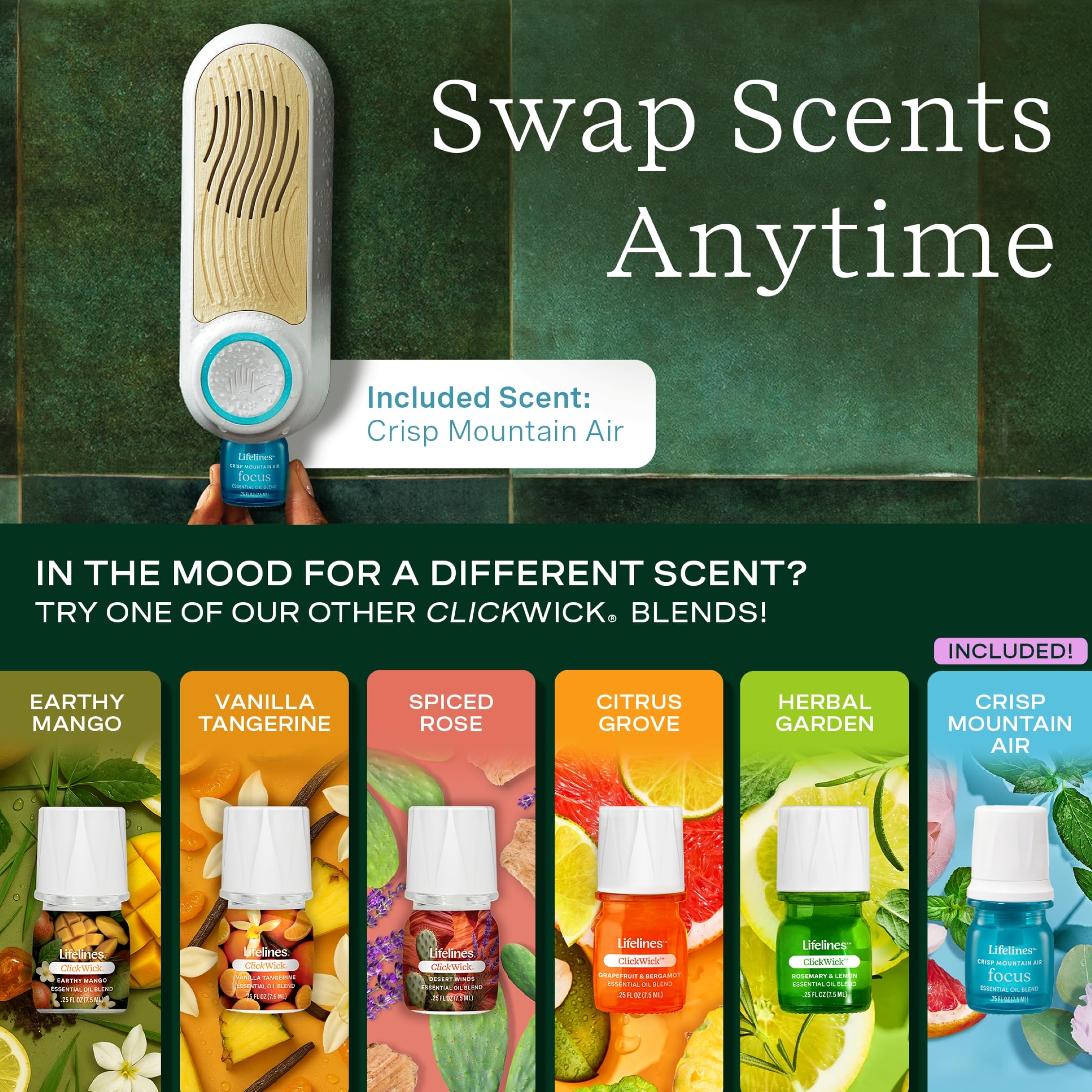 Crisp Mountain Air: Includes a ClickWick Essential Oil Blend in Crisp Mountain Air, featuring hints of cornmint and peony for a beautiful aroma experience.