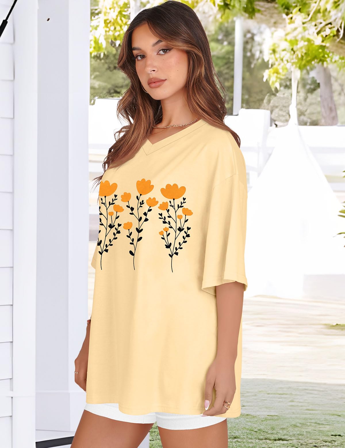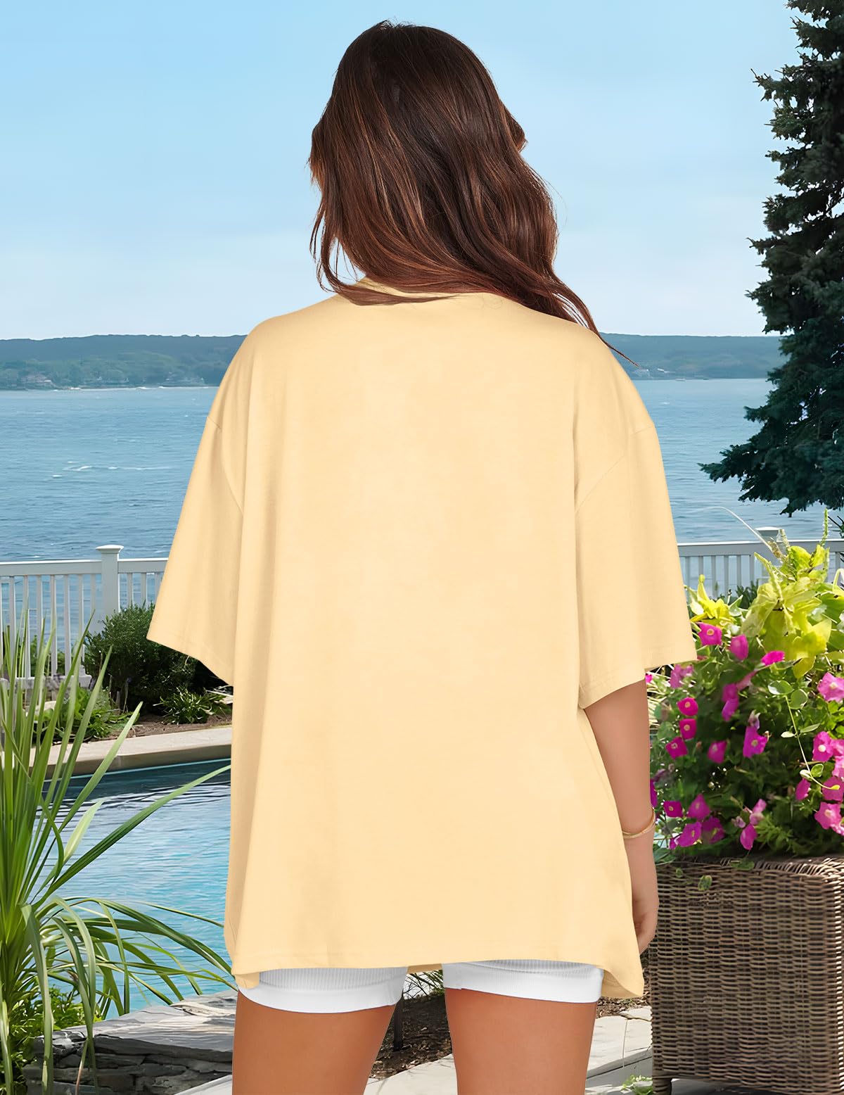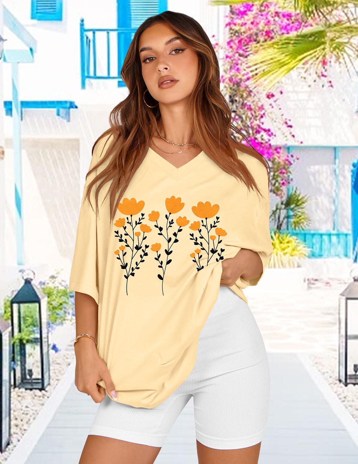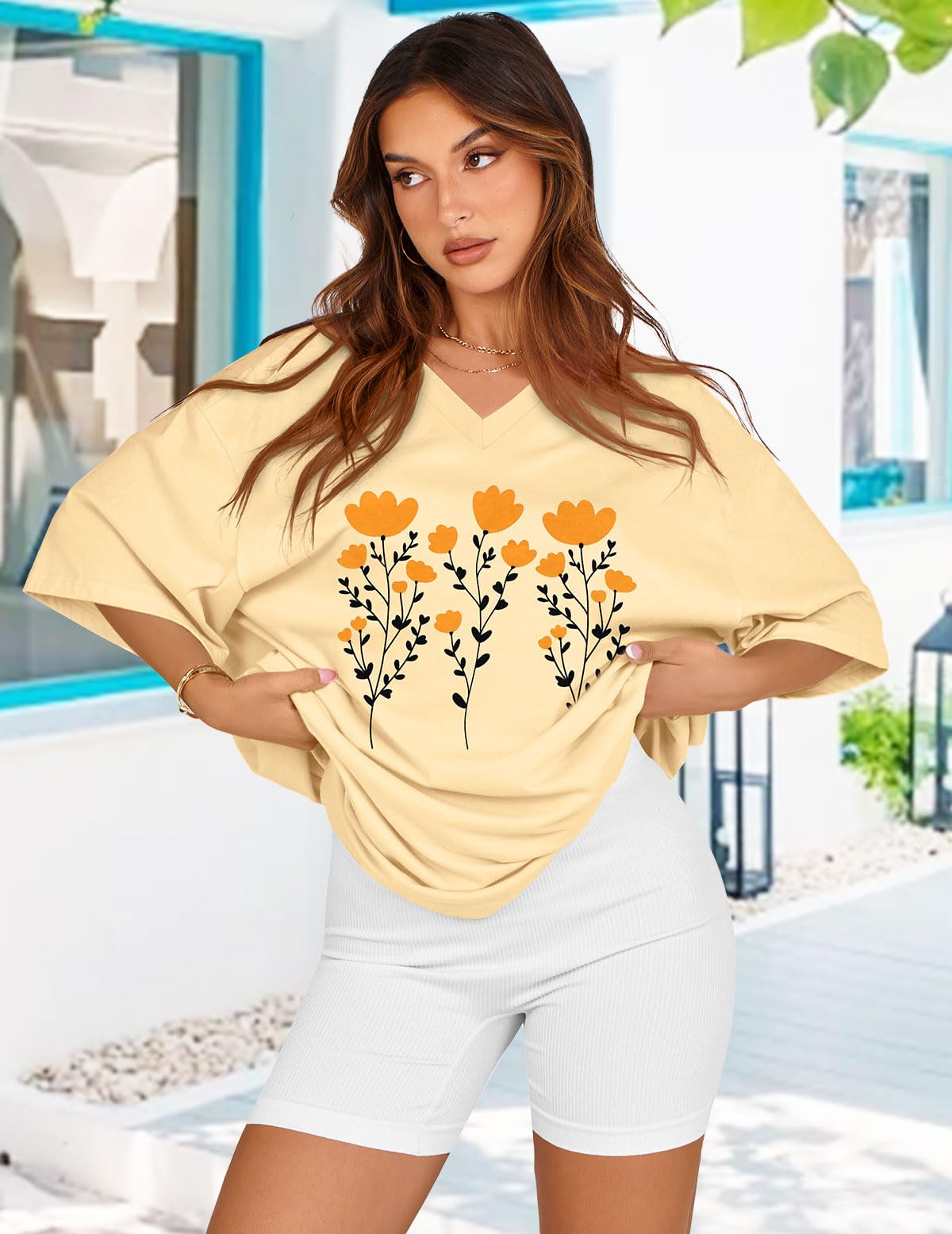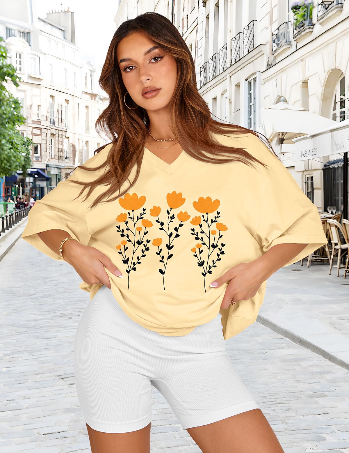 Match: Oversized graphic tees can be effortlessly matched with various garments, such as yoga pants, leggings, shorts, skirts, or jeans, Graphic tees for women can also be adorned with sunglasses or necklaces to boost your elegance