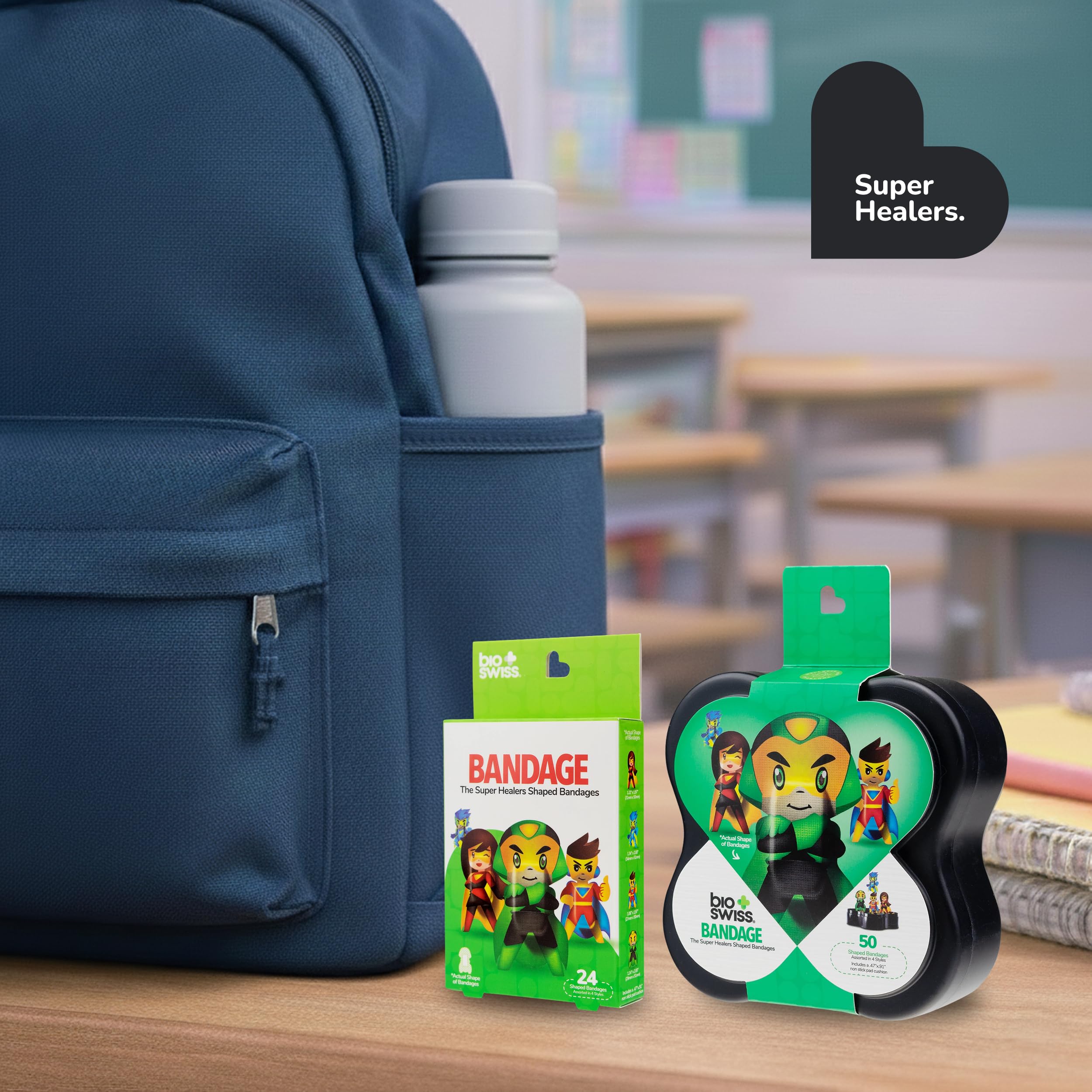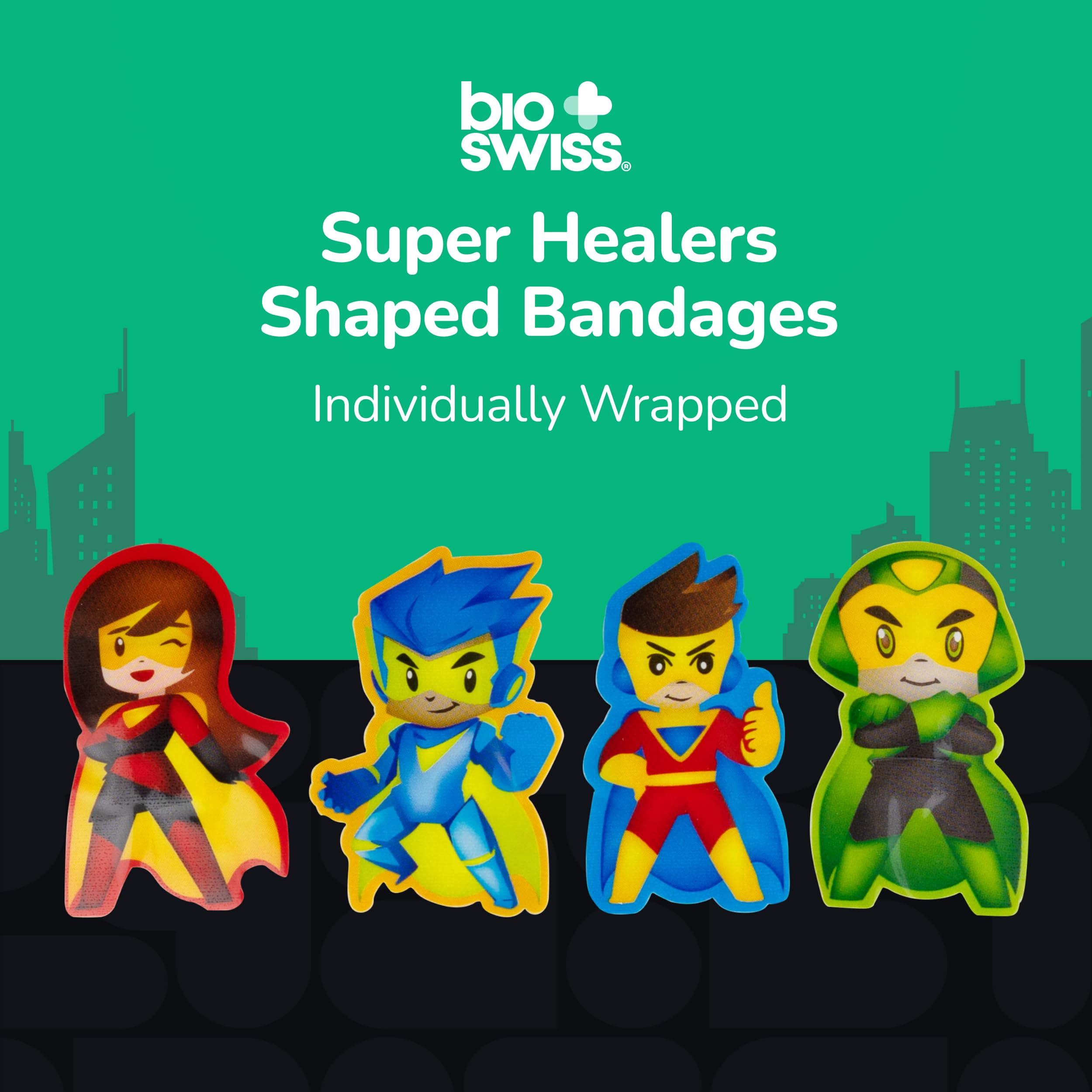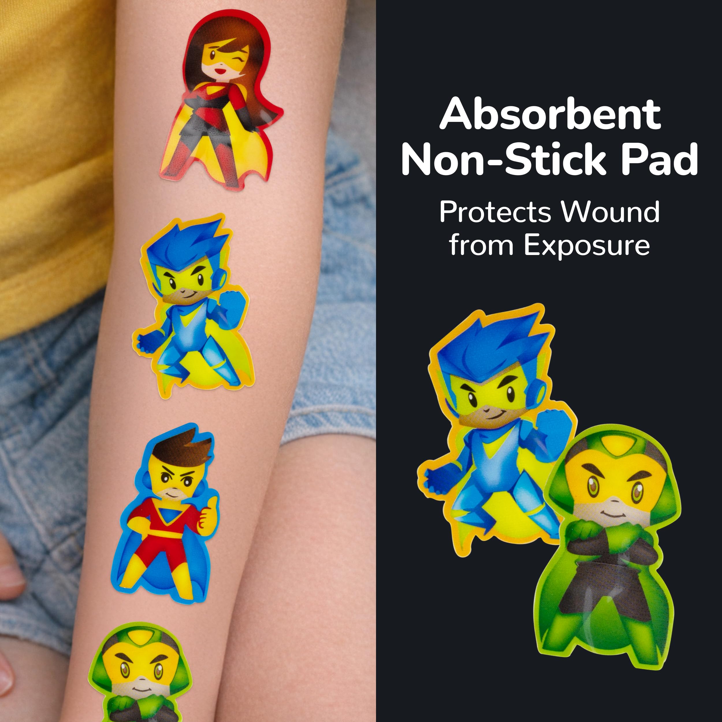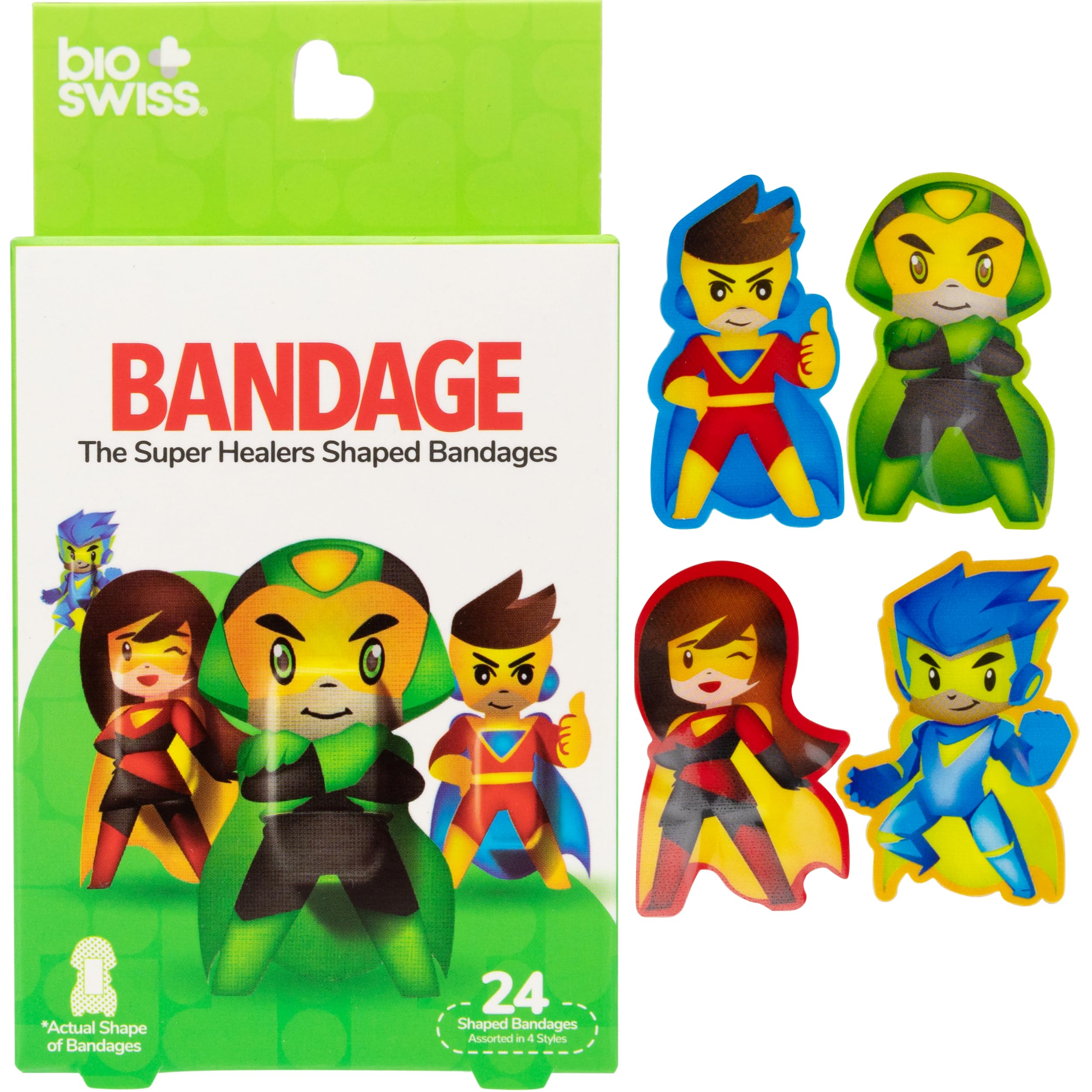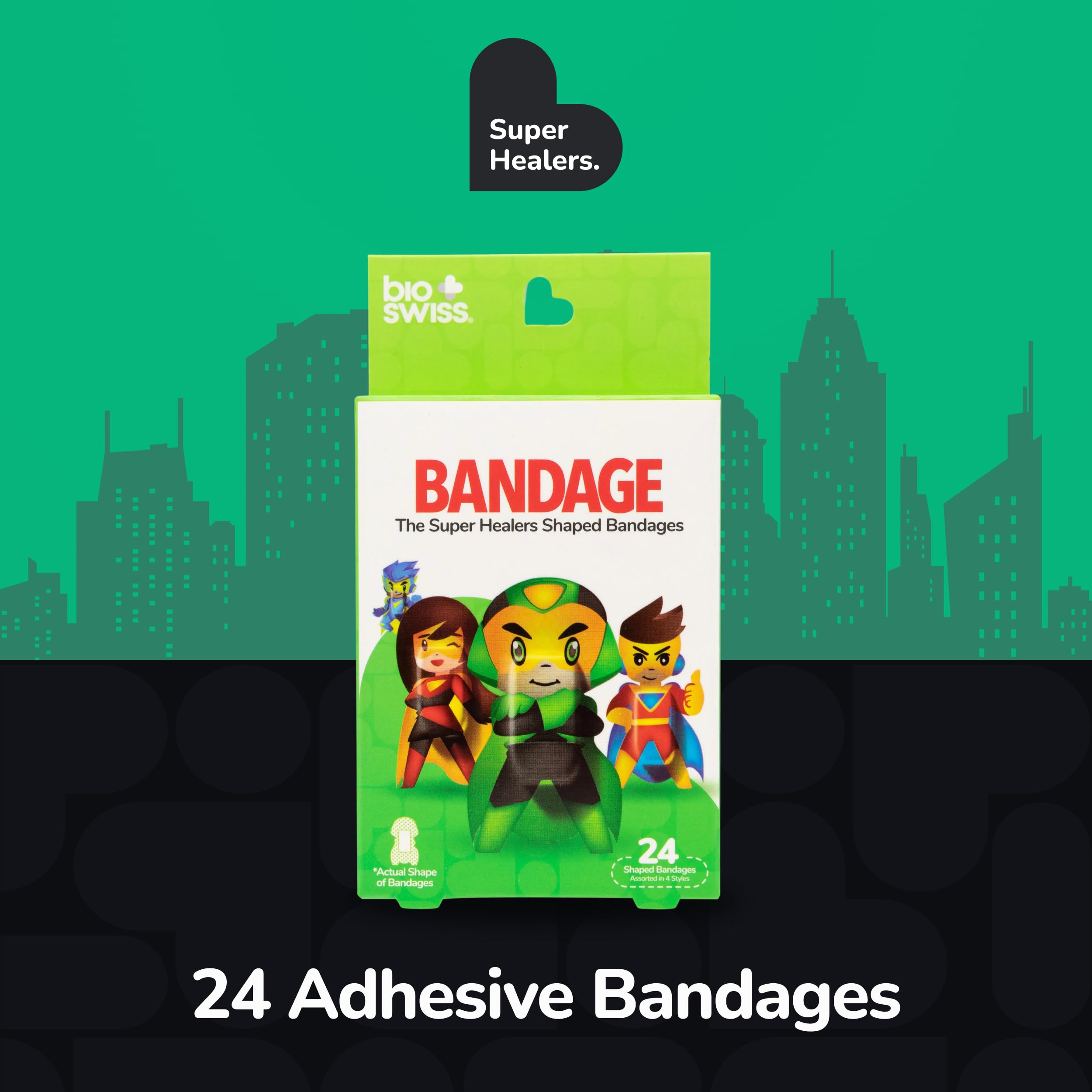 24 SUPERHEROES BANDAGES: Superhero-shaped adhesive bandages pack helps protect cuts, scrapes, and minor wounds while making healing less stressful; bandages come in 4 assorted styles