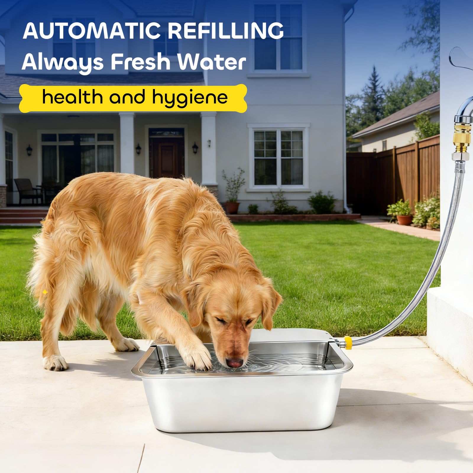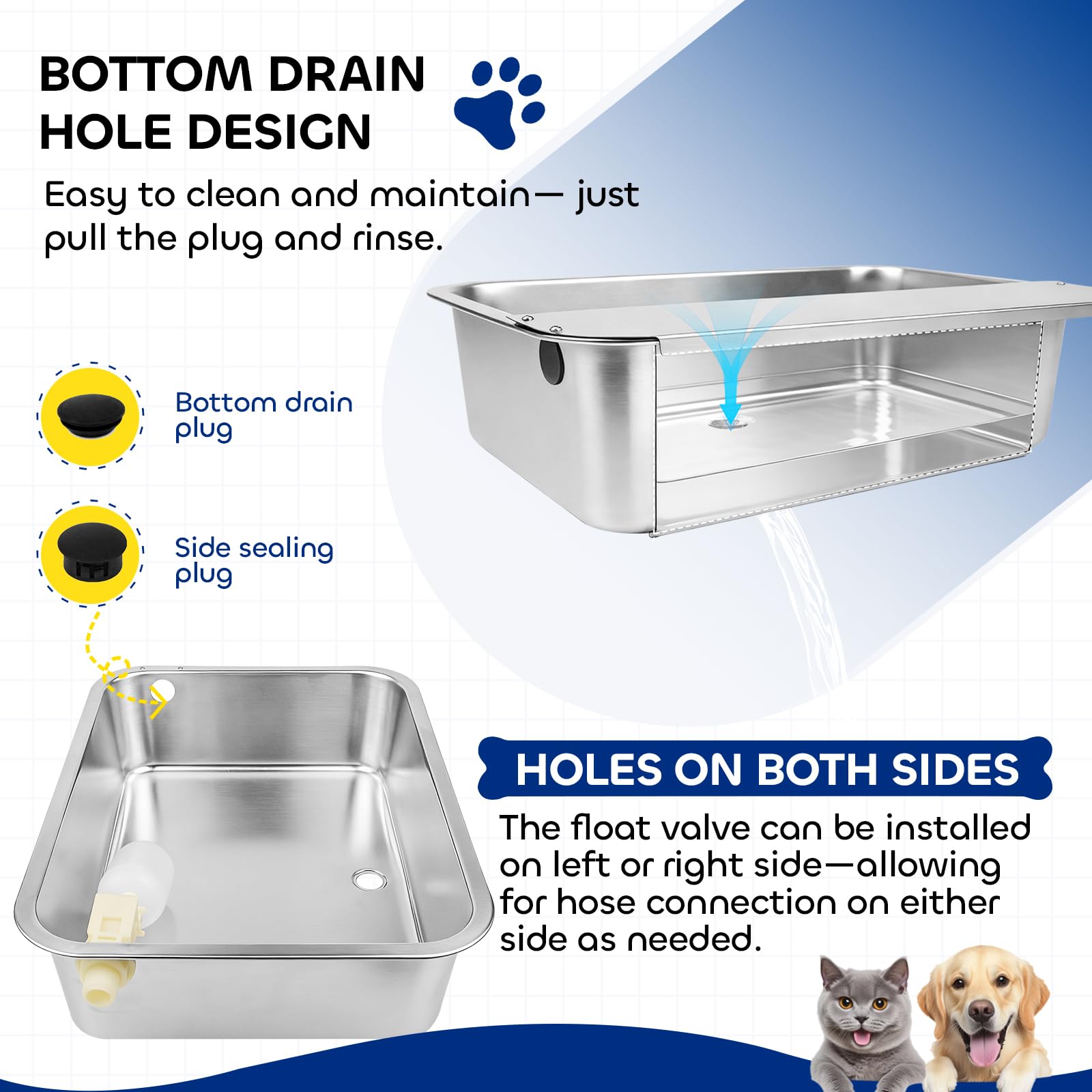 【Flexible Installation & Suitable for Indoors/Outdoors】 Pre-drilled mounting holes on both sides of cat water dispenser allow left or right hose connection based on your space. Included side plugs seal the unused side. Equipped with a standard 3/4" GHT quick-connect fitting for easy attachment to garden hoses or water lines, making it ideal for yards, garages, farms, or indoor kitchens.