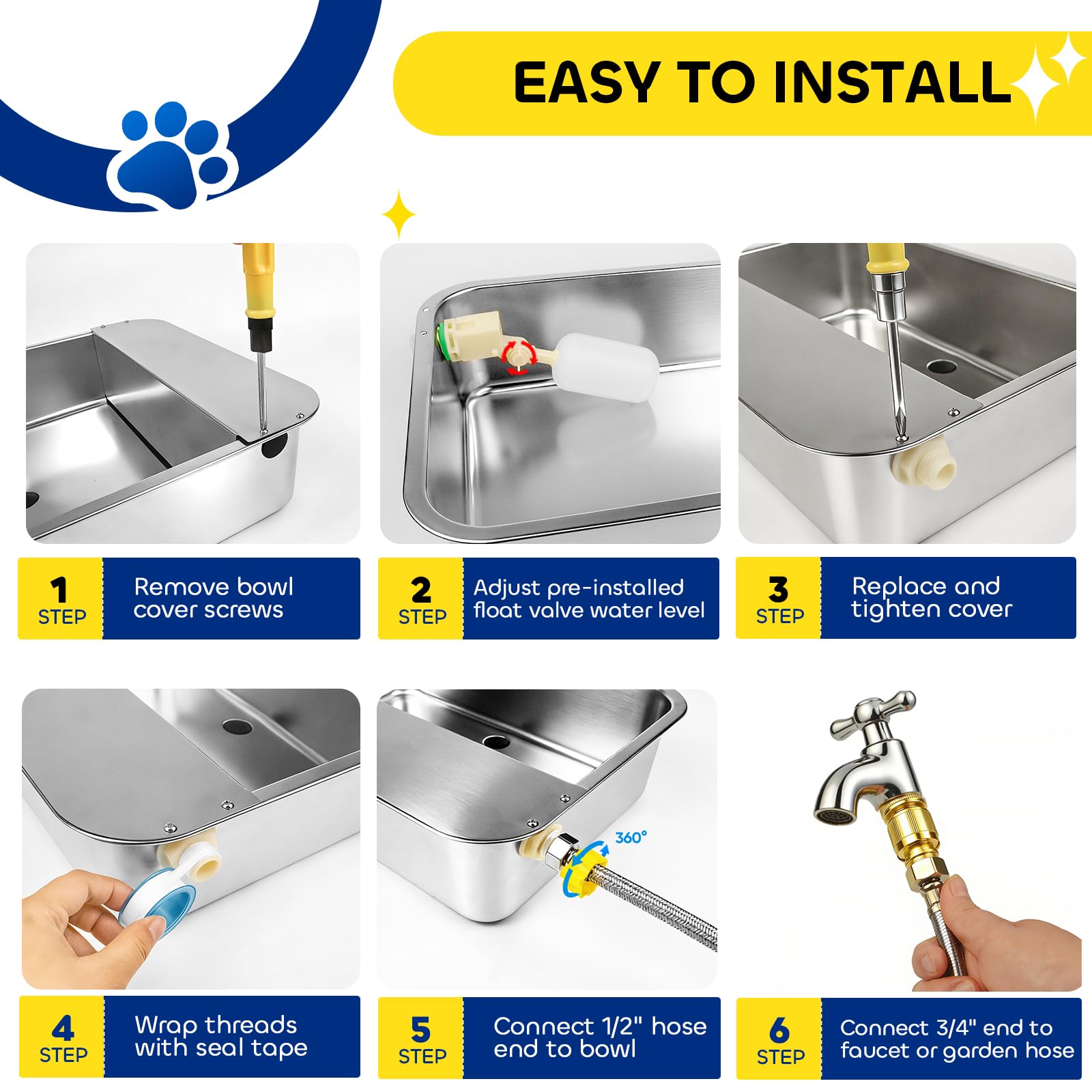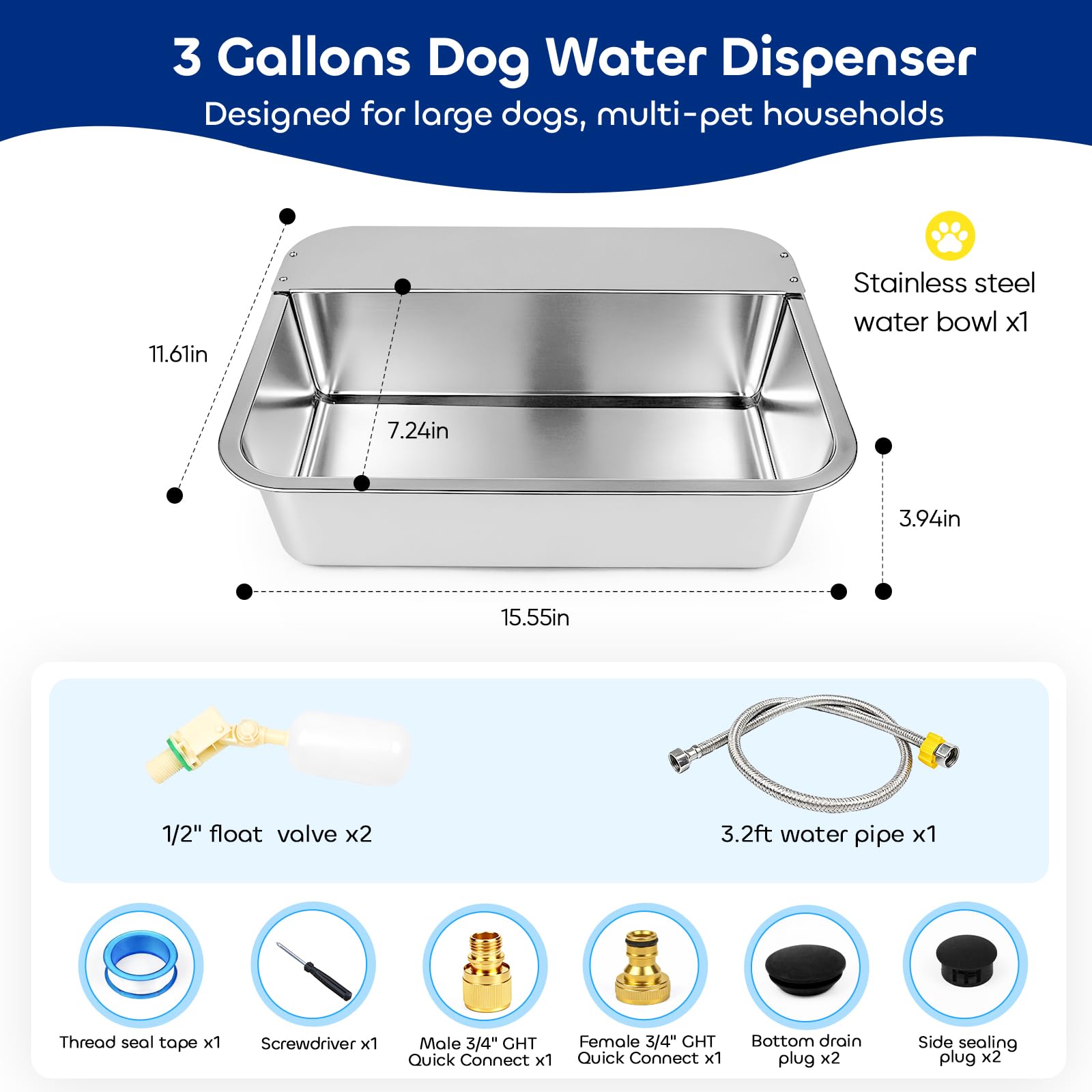 【Complete Accessories & Thoughtful Details】Set includes: Stainless steel automatic dog water feeder ×1, 1/2" float valve ×2 (1 pre-installed), 3.2 ft water hose ×1, male 3/4" GHT threaded quick-connect ×1, female 3/4" GHT threaded connector ×1, bottom drain plug ×2, side plug ×2, sealing tape ×1, screwdriver ×1. The float valve is housed in a protected compartment with a cover to prevent damage from pet chewing.