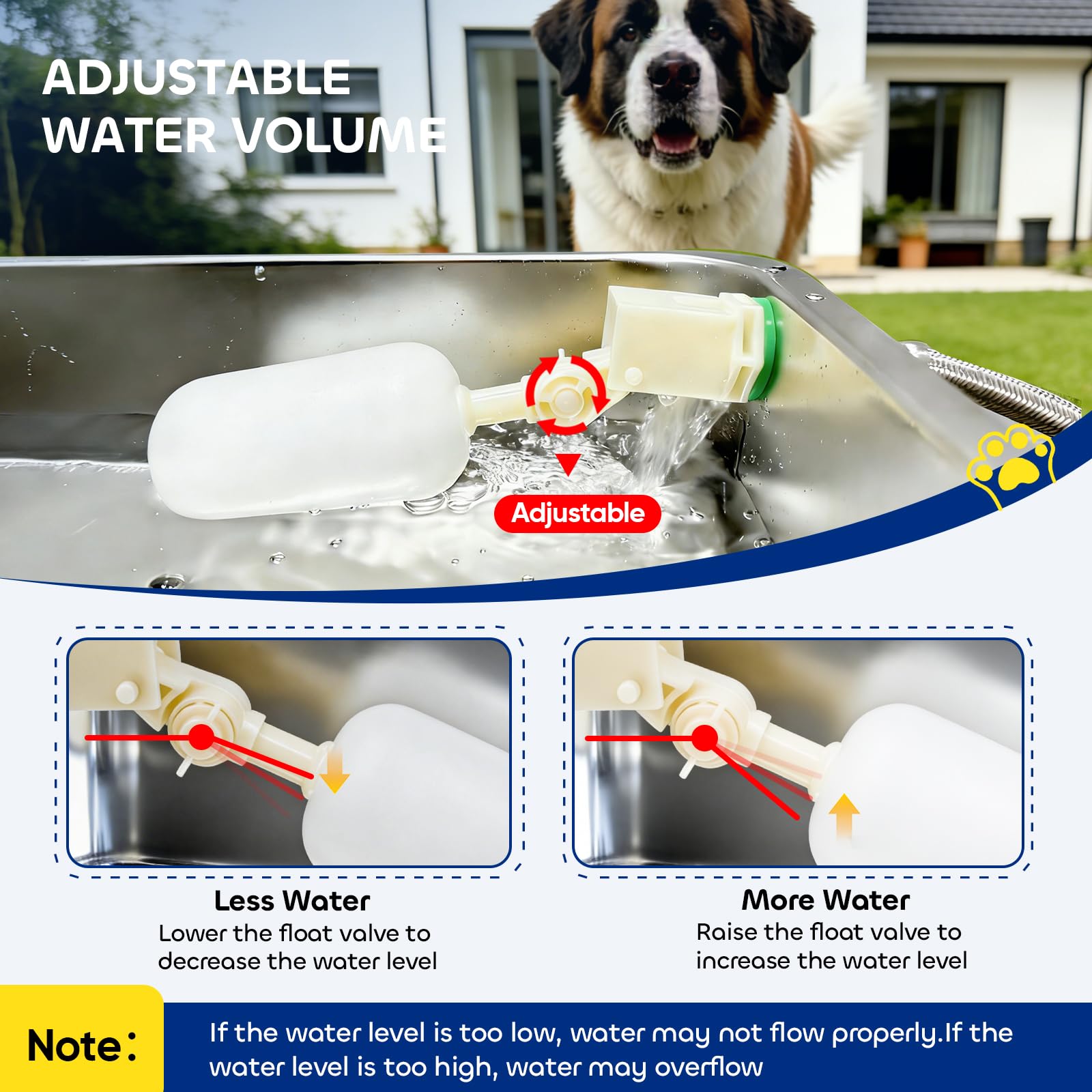 【Adjustable Water Level & Leak-Proof Design】Rotate the float valve adjustment knob to set the float height and control the water level inside the dog water dispenser. This accommodates the drinking habits of pets of different sizes while minimizing water waste and spill risks. A tight-seal structure keeps your floors dry.