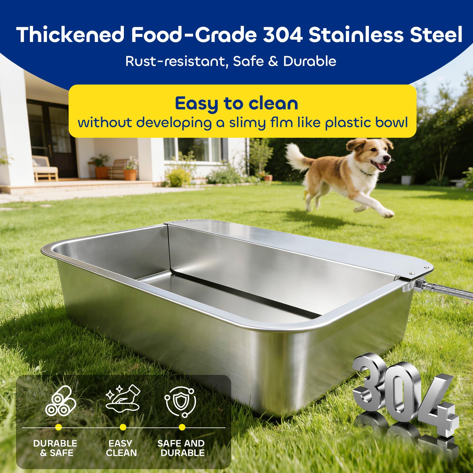【Thickened 304 Stainless Steel Bowl & Easy to Clean】The automatic water dispenser for dogs is made of food-grade thickened 304 stainless steel, offering durability, rust resistance, and safety. Its smooth surface prevents dirt buildup. Designed with a bottom drain hole, cleaning is quick and effortless—just pull the plug and rinse.