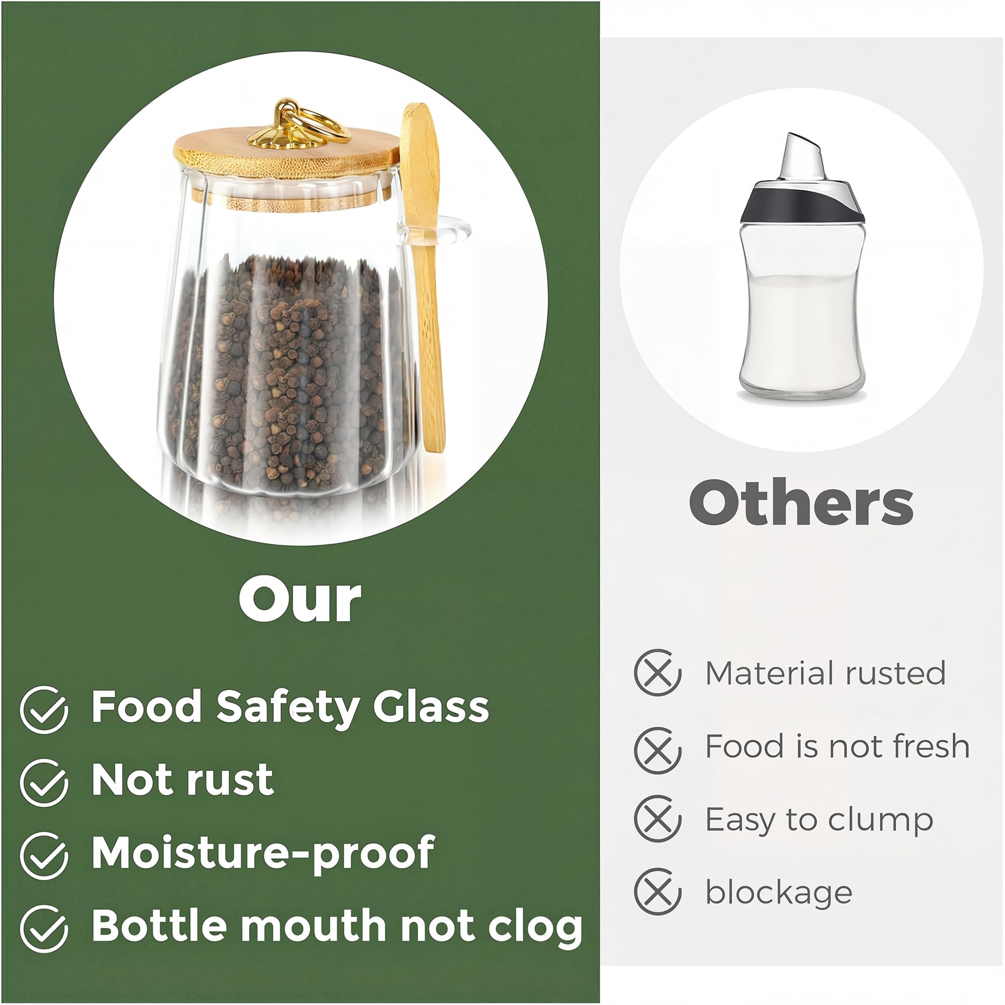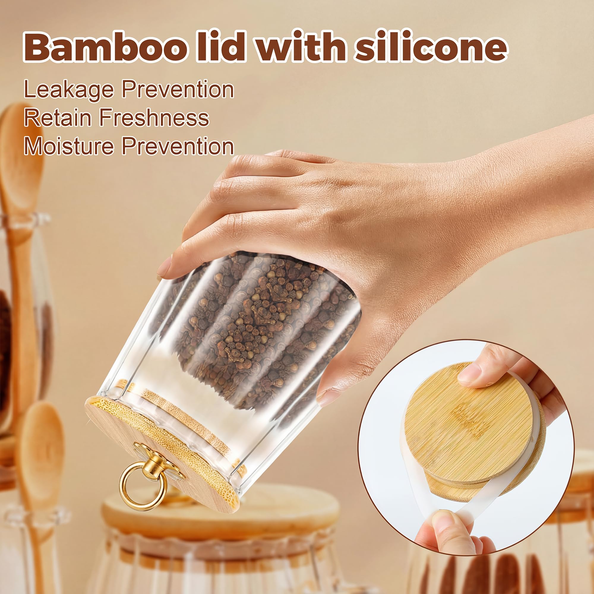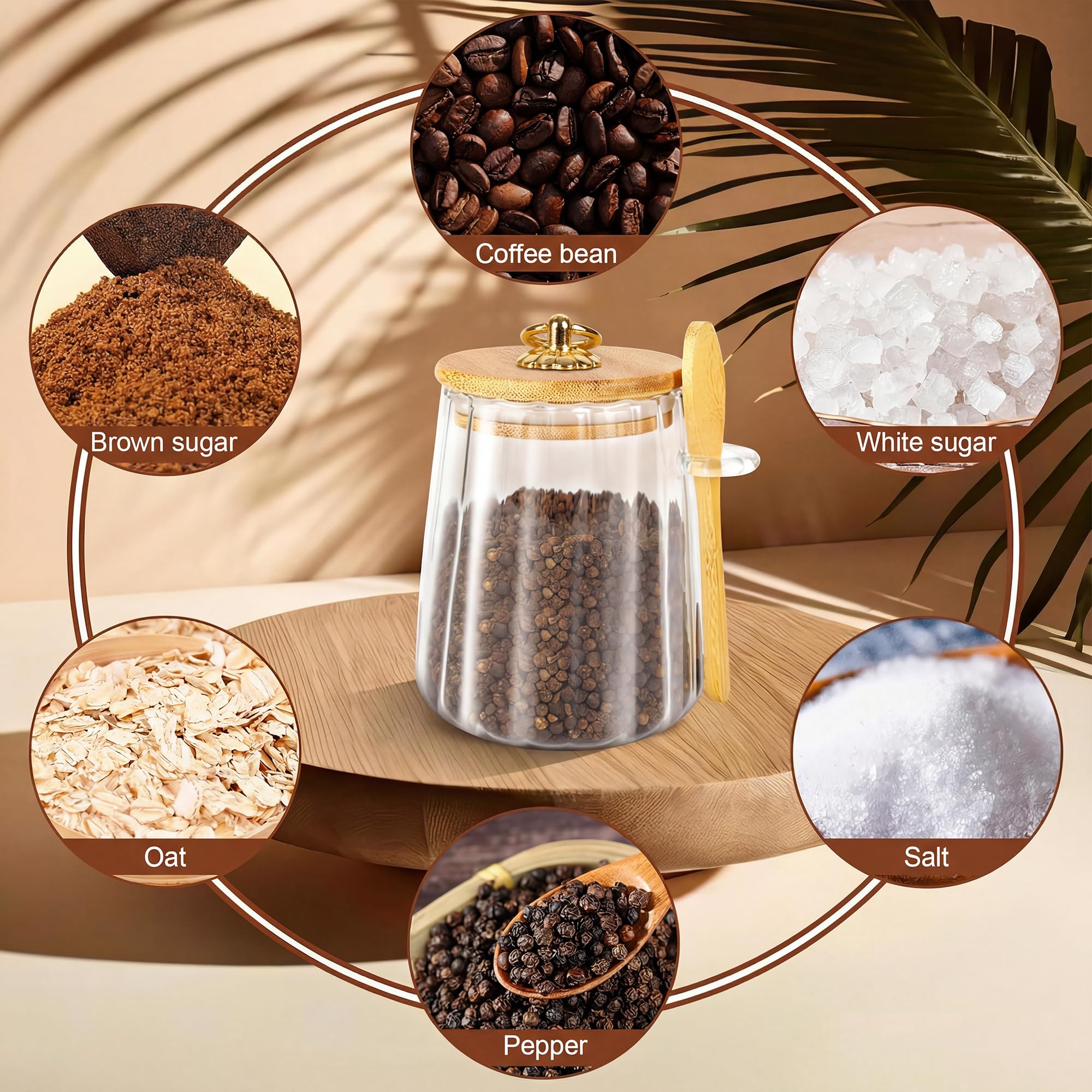 Sleek Aesthetics:Our sugar bowl blends elegance with functionality. Diameter: 3.25 '' Height: 4.75 ''. Its lid is made of ecofriendly bamboo and a food-grade silicone ring, and features a gold-plated ring handle for easy use. A bamboo spoon is also included for convenient scooping of food