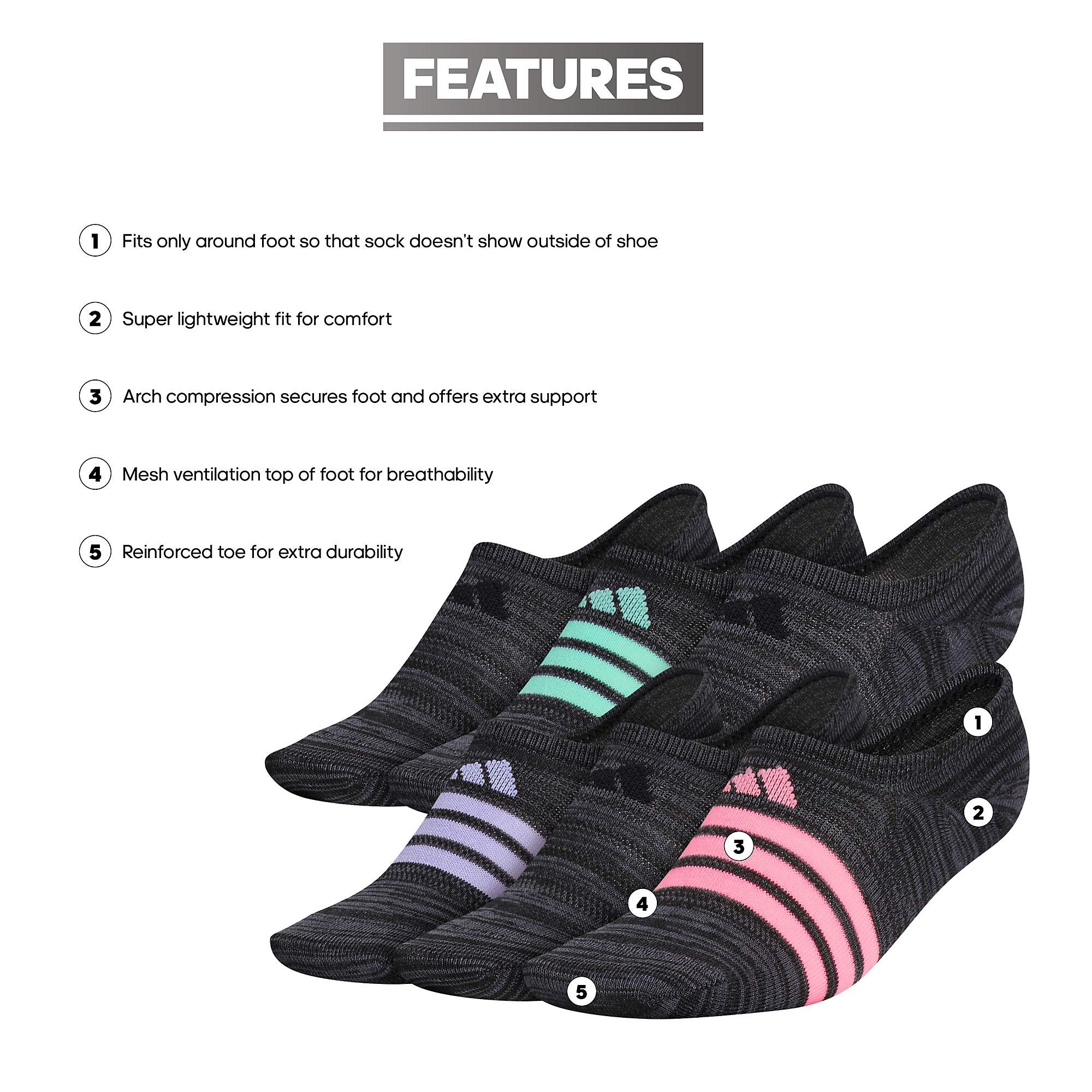 Description Push through your limits in comfort. These sneaker socks are built with extra ventilation to keep your feet dry and feeling fresh, even during demanding workouts. A reinforced toe and arch compression add durability and support to each step.