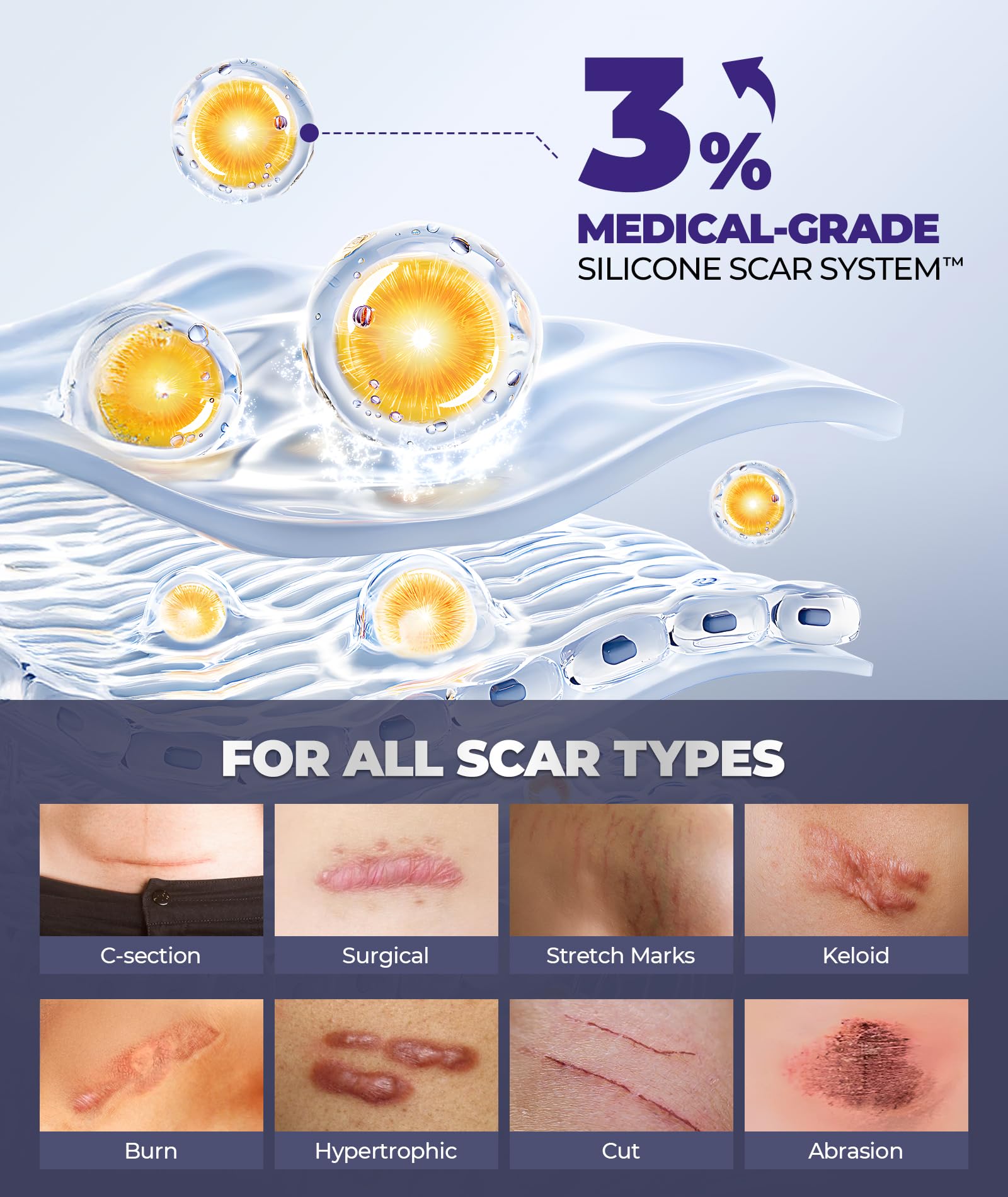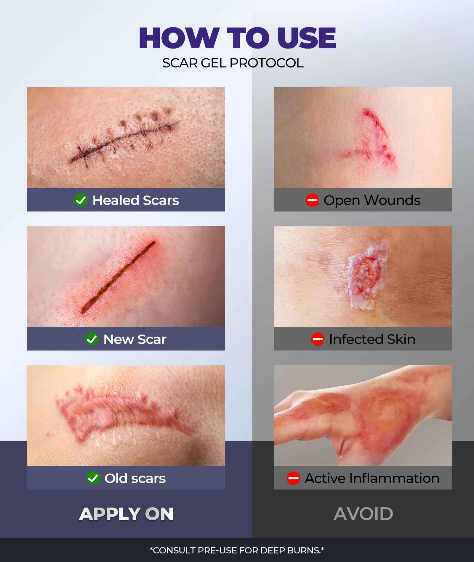 START NOW - MAKE SCAR-FREE YOUR NEW REALITY. Manufactured in GMP-certified & FDA-registered facilities under strict quality standards, silicone scar gel is designed for everyday use to help reduce the appearance of scars. Apply 2–3 times a day. New scars improve in 2–8 weeks; old scars improve in 3–6 months. Results may vary. For next-level results, pair the scar gel with silicone scar sheets, scar tape, burn cream, scar oil, bruise cream, or a scar stick. This scar cream is intended to improve the appearance of scars only and is not intended to diagnose, treat, cure, or prevent any disease.