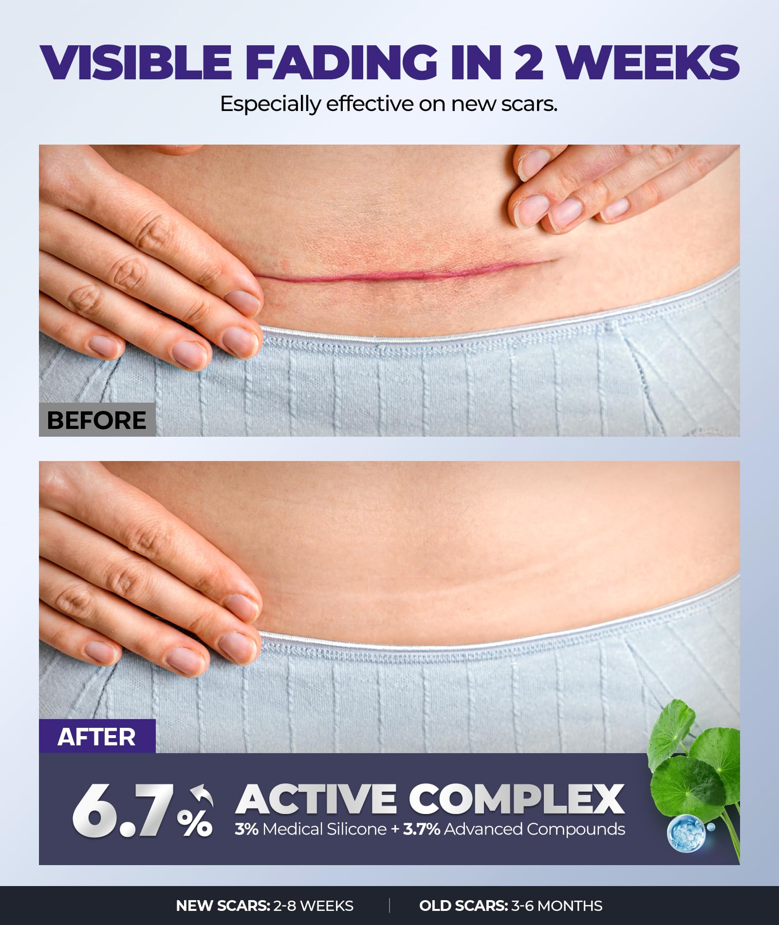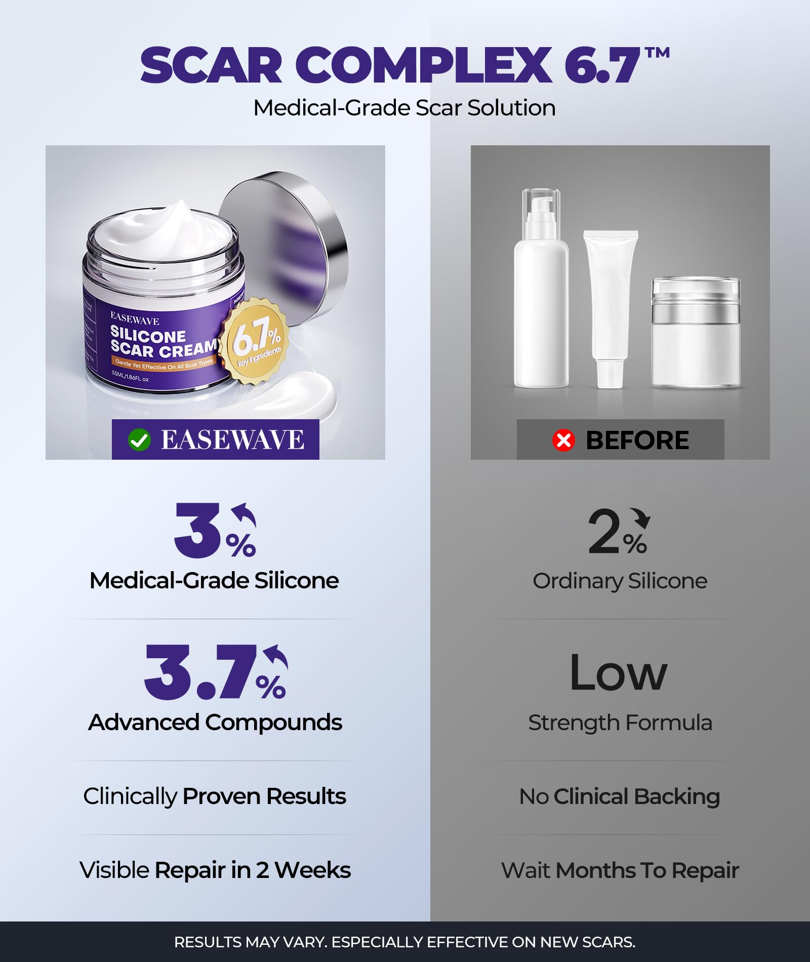 WATCH NEW SCARS FADE IN JUST 2 WEEKS! Tired of waiting months for scar results? So were we. That’s why we created EASEWAVE Ultimate Scar Cream, an upgraded formula powered by 6.7% active complex (3% medical-grade silicone + 3.7% advanced compounds). It targets scars from surgeries, C-sections, burns, acne, and pregnancy stretch marks. While other scar creams keep you waiting, EASEWAVE scar removal cream delivers visible improvements in as little as 2 weeks—especially on new scars. Stop wasting time-restore your skin faster, rebuild confidence, and wear what you love again, and on your terms.