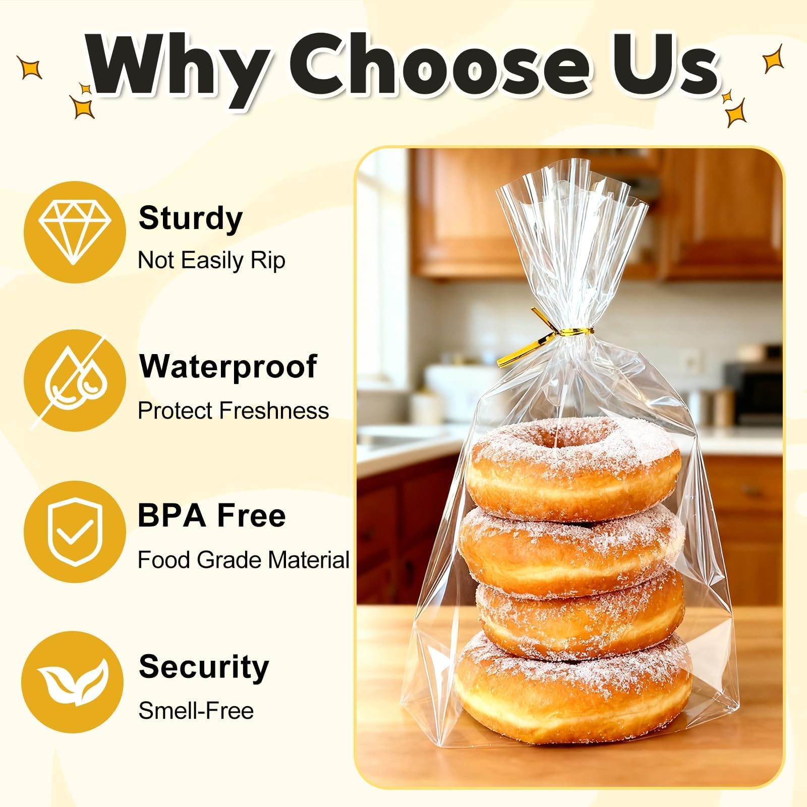 100% Food-Safe New Polypropylene – Keeps Treats Fresh: Crafted from 100% food-grade, odorless polypropylene, these clear cellophane bags are safe for direct contact with baked goods. Moisture-resistant material preserves freshness for short-term storage—ideal for mini loaves, muffins, chocolates, and fruit packaging