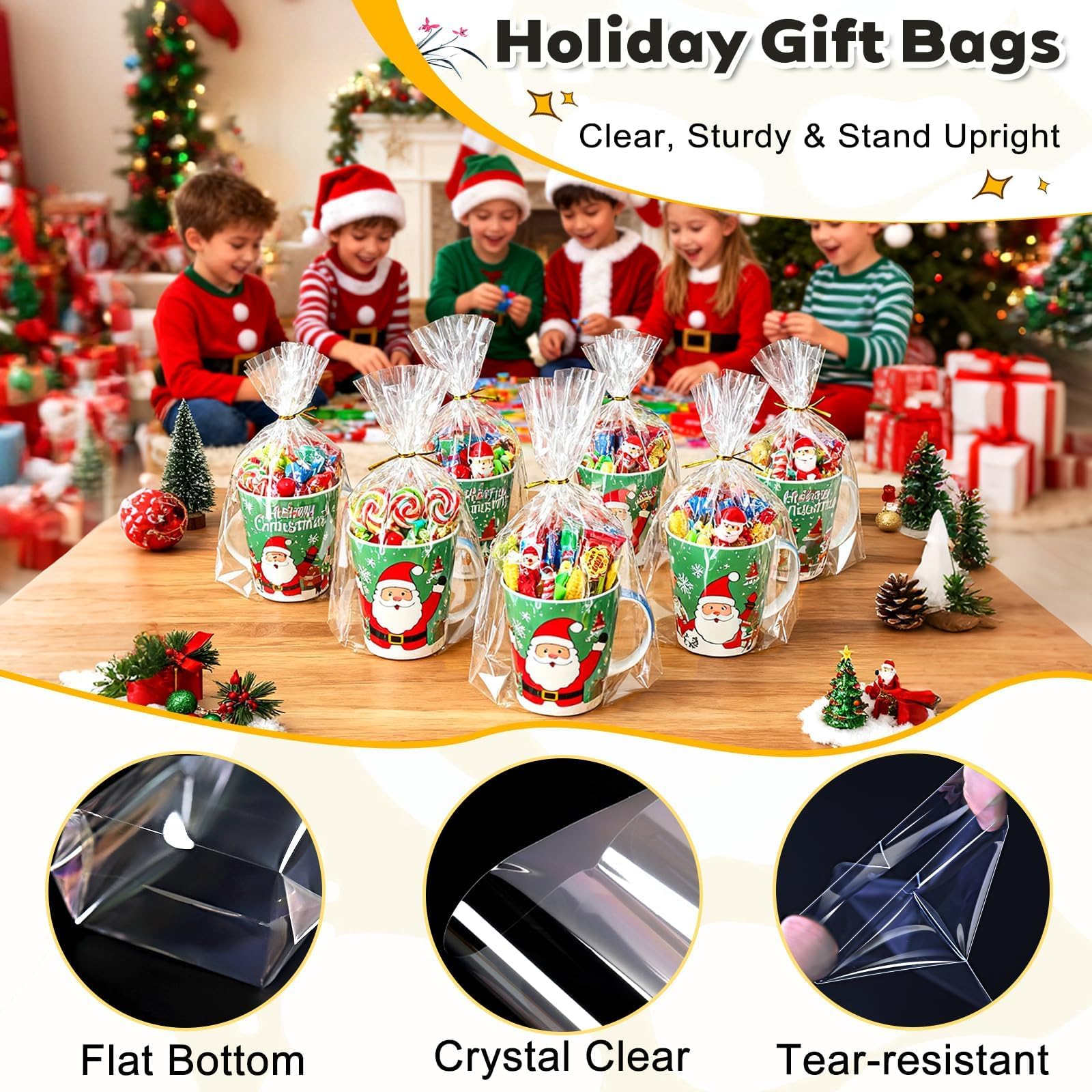 Thick, Crisp Texture with High Transparency and Shape Retention: Made from thicker, high-quality clear OPP, these clear bags for gifts are firmer and more rigid than regular clear plastic bags, delivering a satisfying crisp sound when handled. It beautifully showcase gifts like mugs, tumblers, candles, soaps, bath sets, and DIY crafts, maintaining shape even when lightly filled