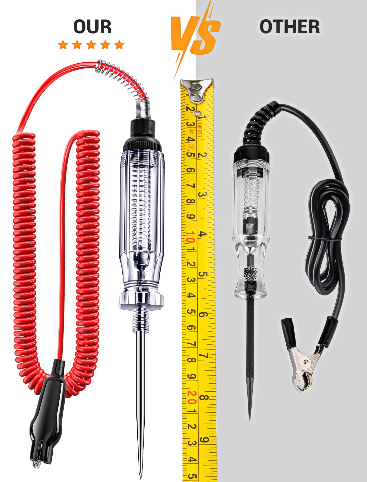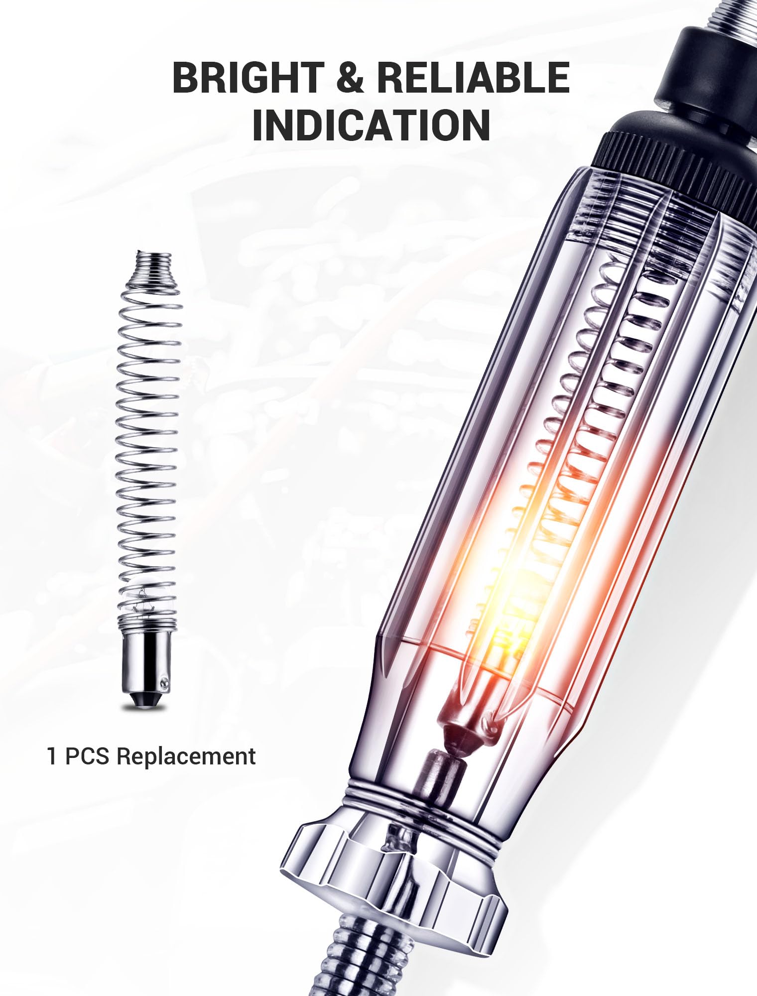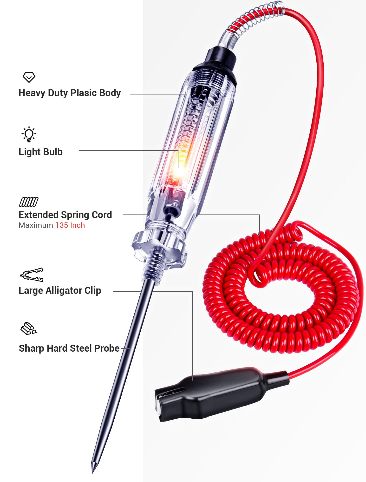 【Extra Spring Light Bulb】 : High visibility and strictly tested long service life spring test light bulb to indicate circuits’ signal. Can be used for common 6V-12V-24V DC circuit test; We throw in a replacement spring bulb as an extra to make it serve you faithfully for years.