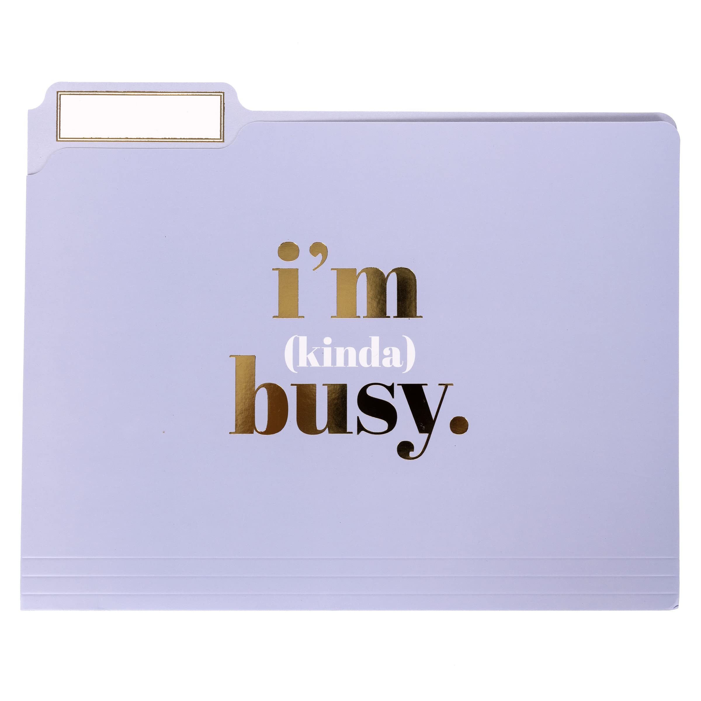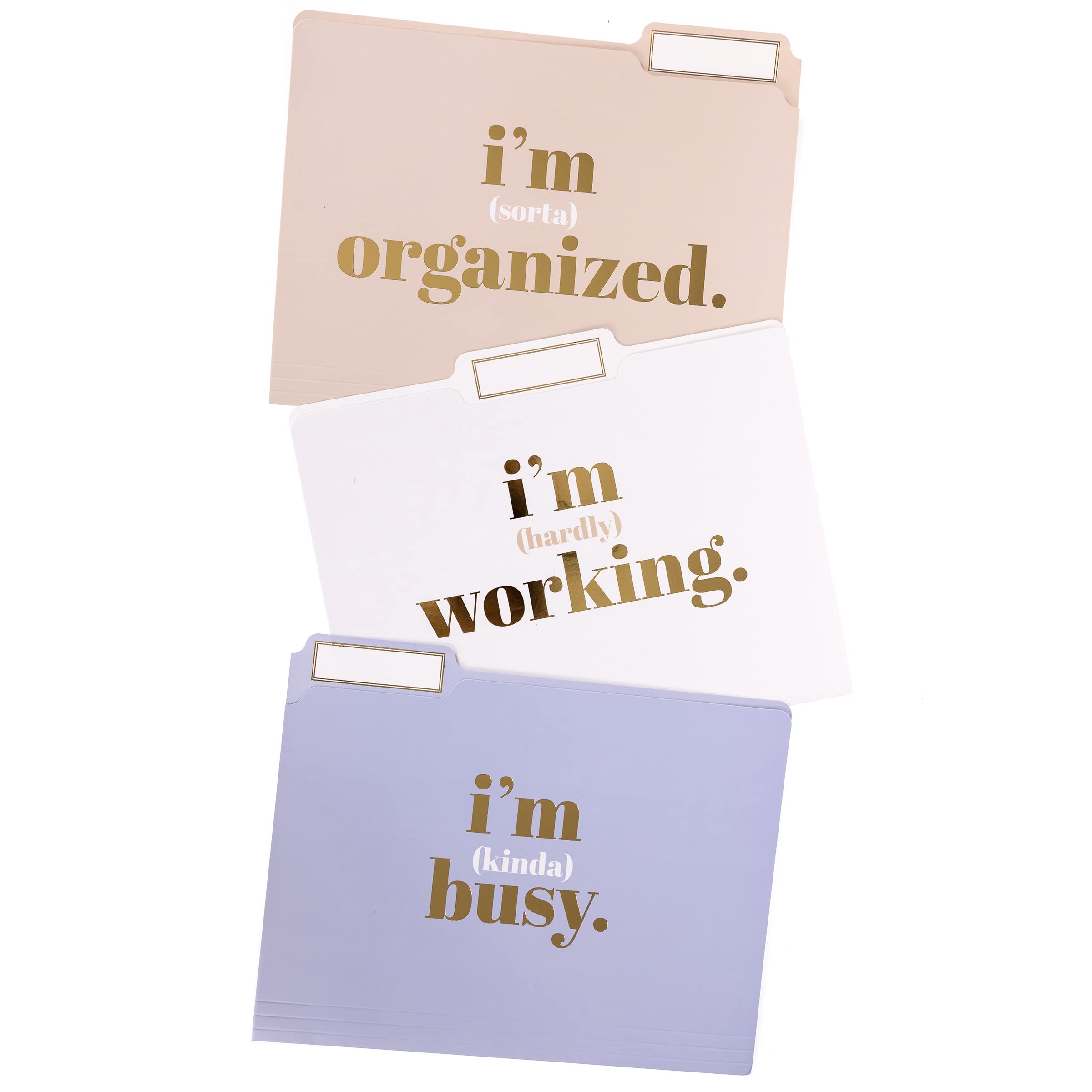 STAY PRIORITIZED These organizing file folders keep you focused on tackling key projects first followed by the others on your to-do list. Decorative gold foil script on these humorous folders include: “I’m (kinda) busy”, “I’m (sorta) organized”, and “I’m (hardly) working”.