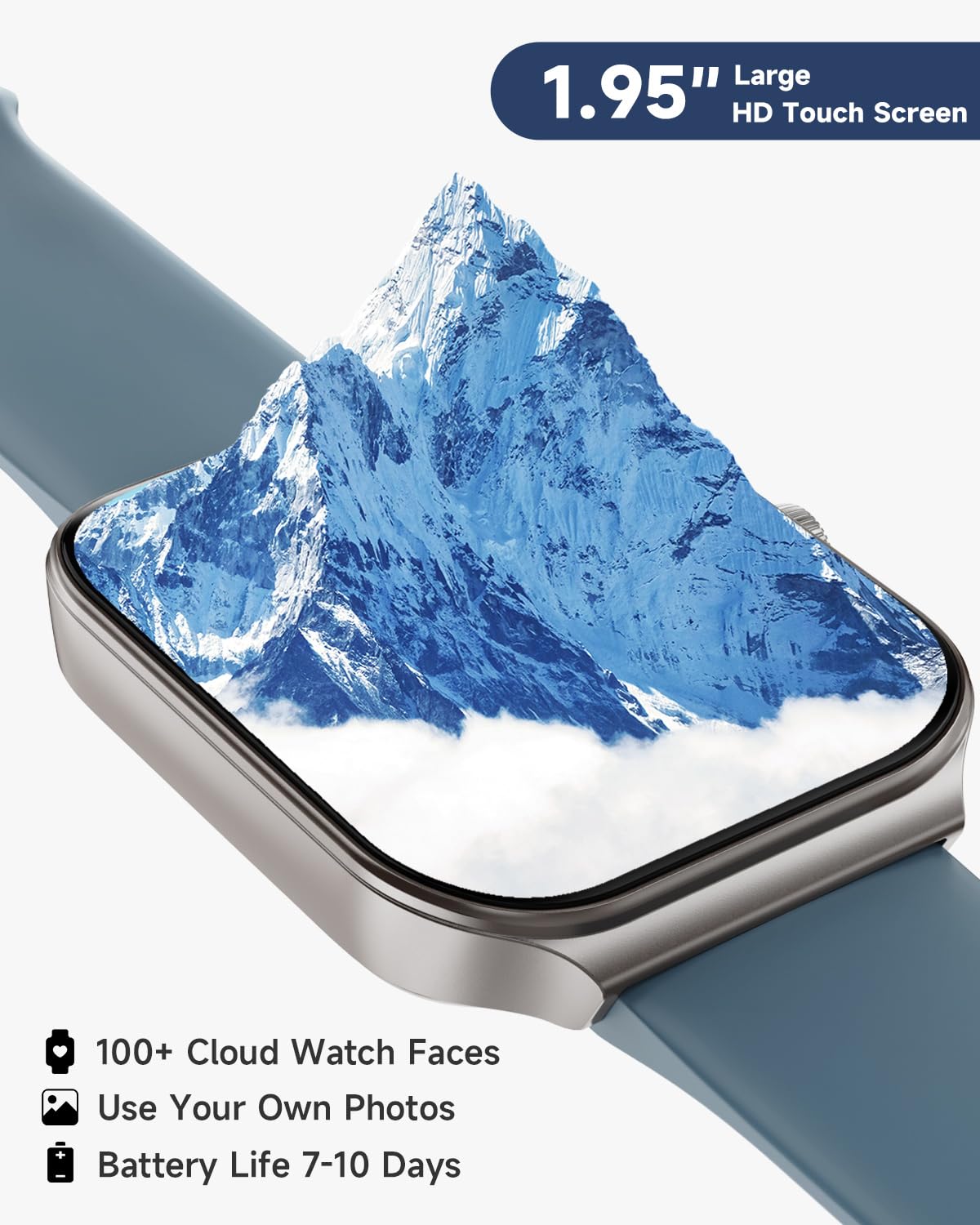 [1.95'' HD Screen & Customizable Watch Face] Experience crystal-clear visuals like never before with our smartwatch's 1.95-inch high definition screen. Choose from 100 beautiful cloud-based watch faces or even upload your own photos, such as selfies or pictures of your pets, to create a truly personalized look. With endless possibilities, you'll never run out of options to make your watch truly your own.