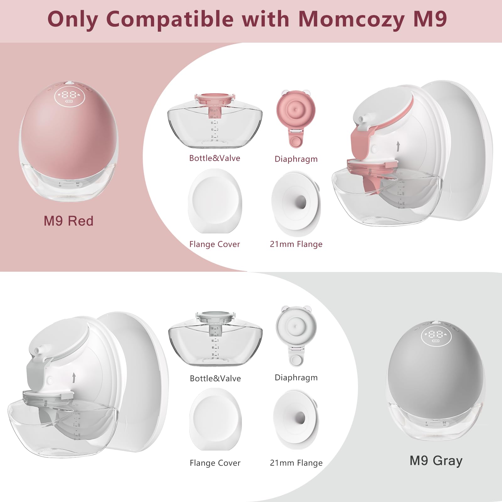 【Interchange with Upgraded M9 Pump】: The M9 Full Breast Pump Replacement Accessories compatible well with Momcozy Upgraded Mobile Flow | M9, Including:21mm Flange*1, Red Valve*1, Red Diaphragm*1, Storage Bottle with Red Lip*1. A set is enough to meet the replacement needs of Upgraded Mobile Flow M9 parts. Made by IVARONAL, Not Original Mom cozy Accessories.