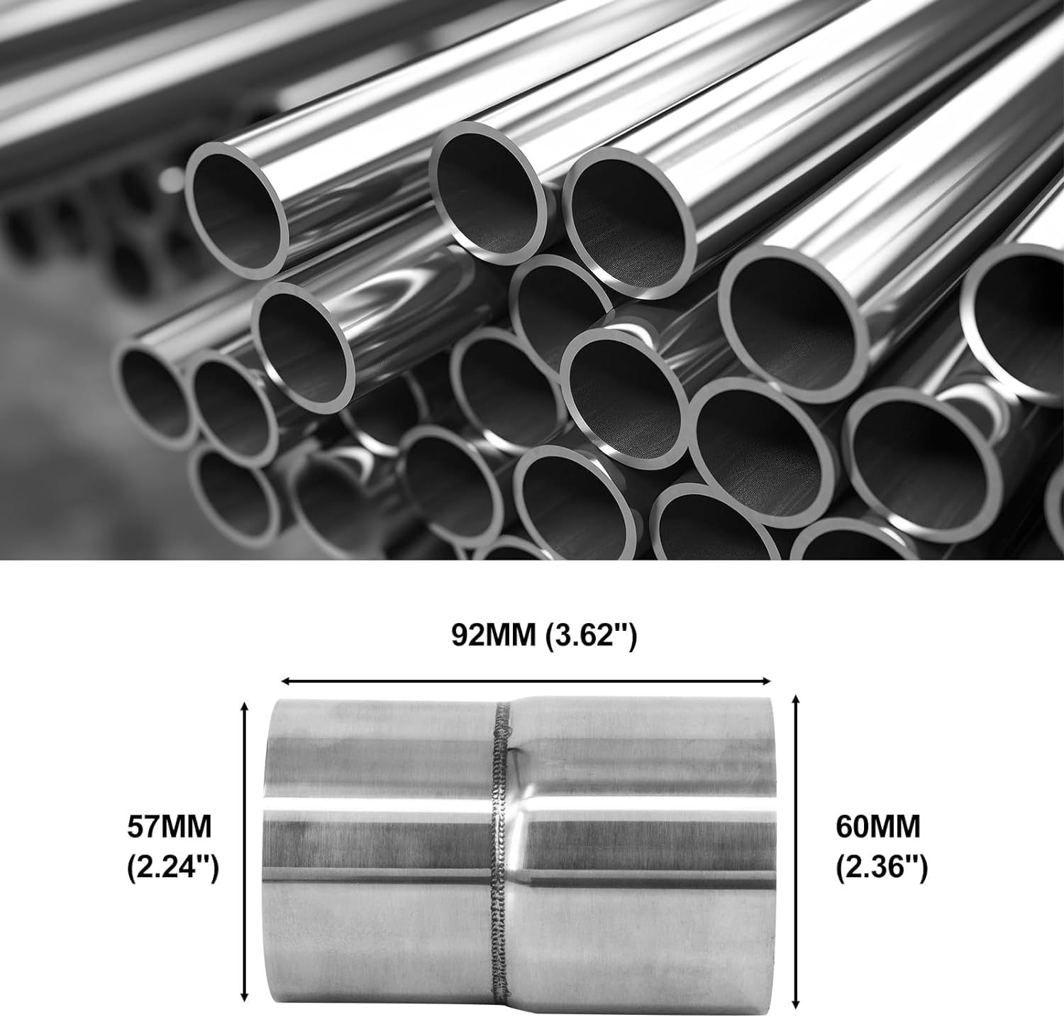 【 Material】: The2.25" ID 2.25" OD exhaust pipe adapter Connector Reducer is constructed with 304 Stainless steel. It is totally rust and corrosion resistant.