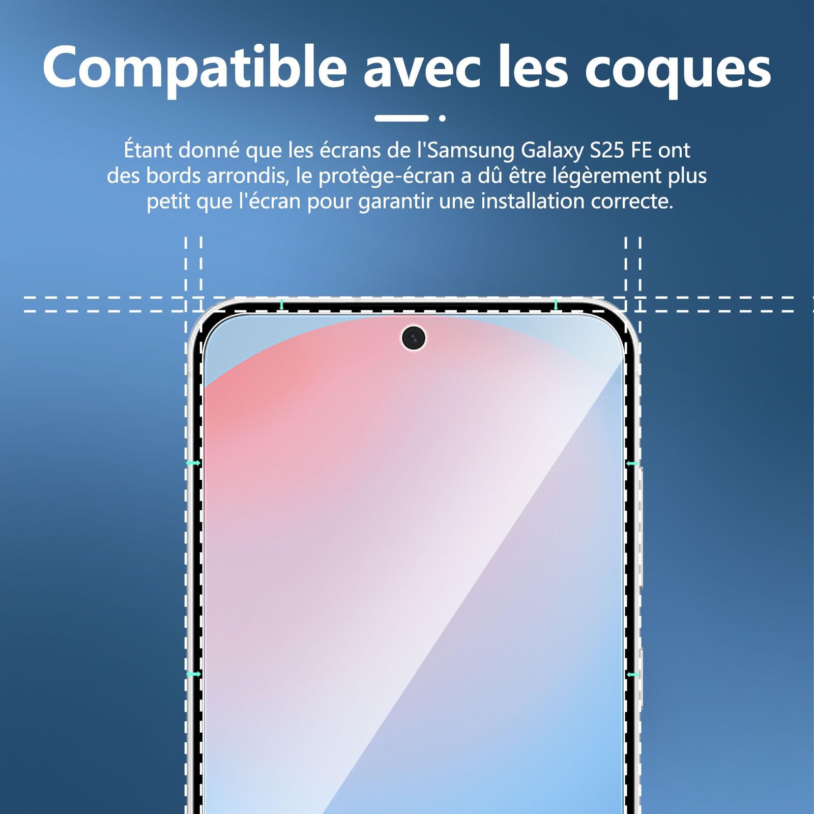 The screen protector provides the maximum protection for Samsung Galaxy S25 FE touchscreen. The space between Samsung Galaxy S25 FE and the screen protector enables the proper space for the installation of most phone cases.