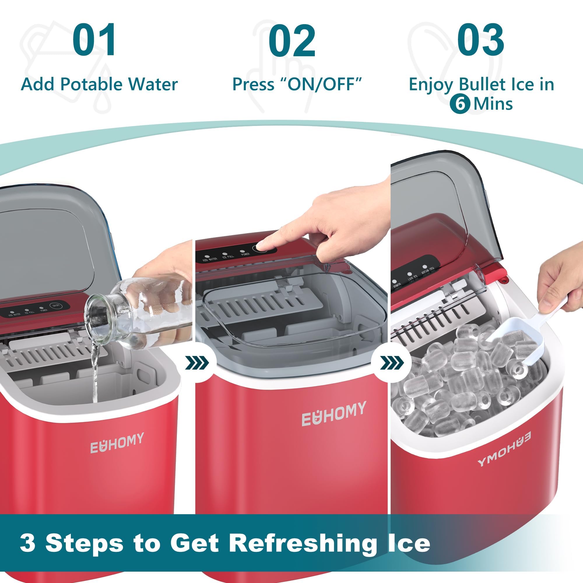 Included Accessories & Service Promise: Include handle, ice basket, ice scoop, manual and well-designed package. Our Mission is committed to providing customers with premium Euhomy ice maker at a reasonable price. You totally deserve a more exquisite life! We offer 12-month after-sales service from the original purchase date & technical service support. Suppose you have any questions about using our Ice Maker, our customer support is always ready to help you