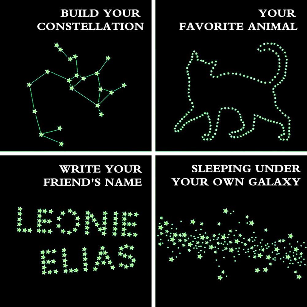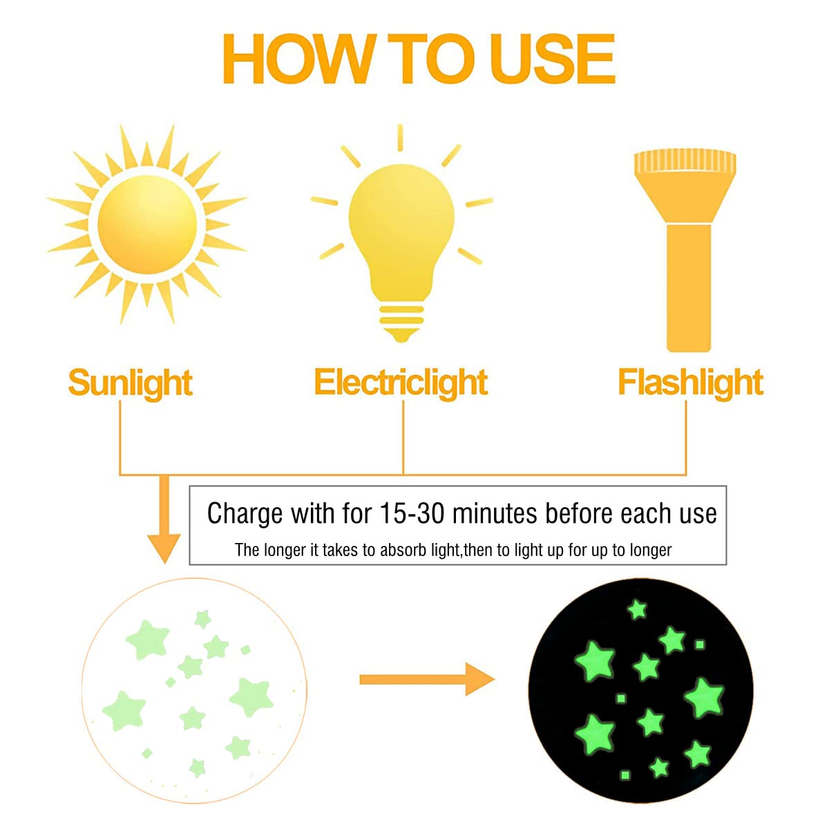 ✦【LONG LENGTH OF GLOW】Just place on any clean, flat surface, and turn on the light for 15-30 minutes then off, because the stickers need to absorb light before glowing. The longer it takes to absorb light,then to light up for up to longer. After the series thing, there will be a glowing view in front of your eyes.The wall stickers hold by the use of a special adhesive film on any common surface easily.