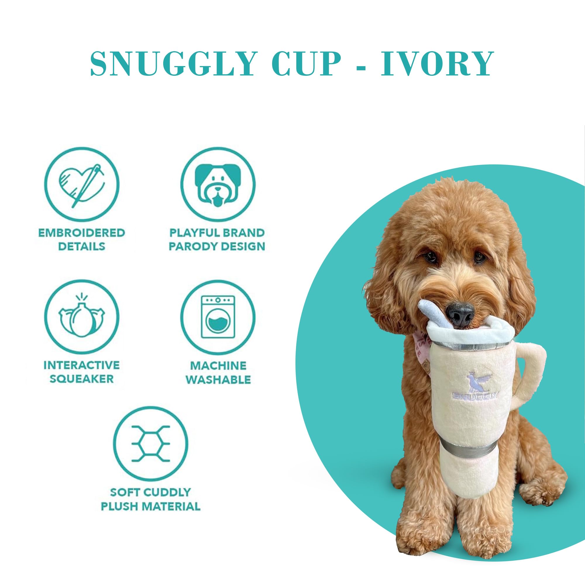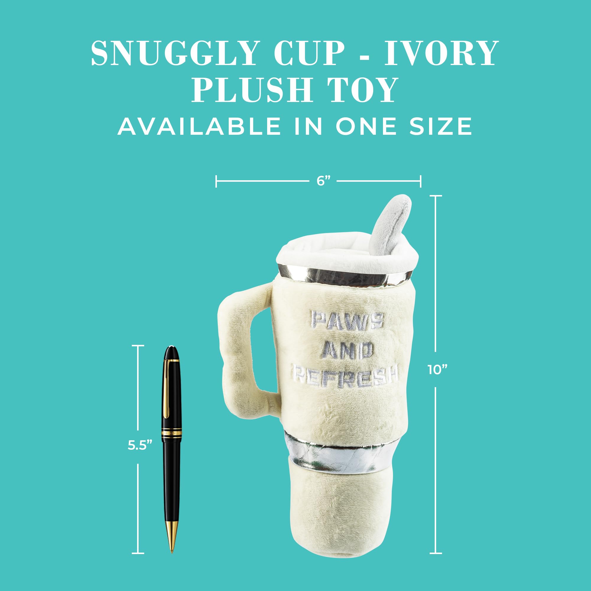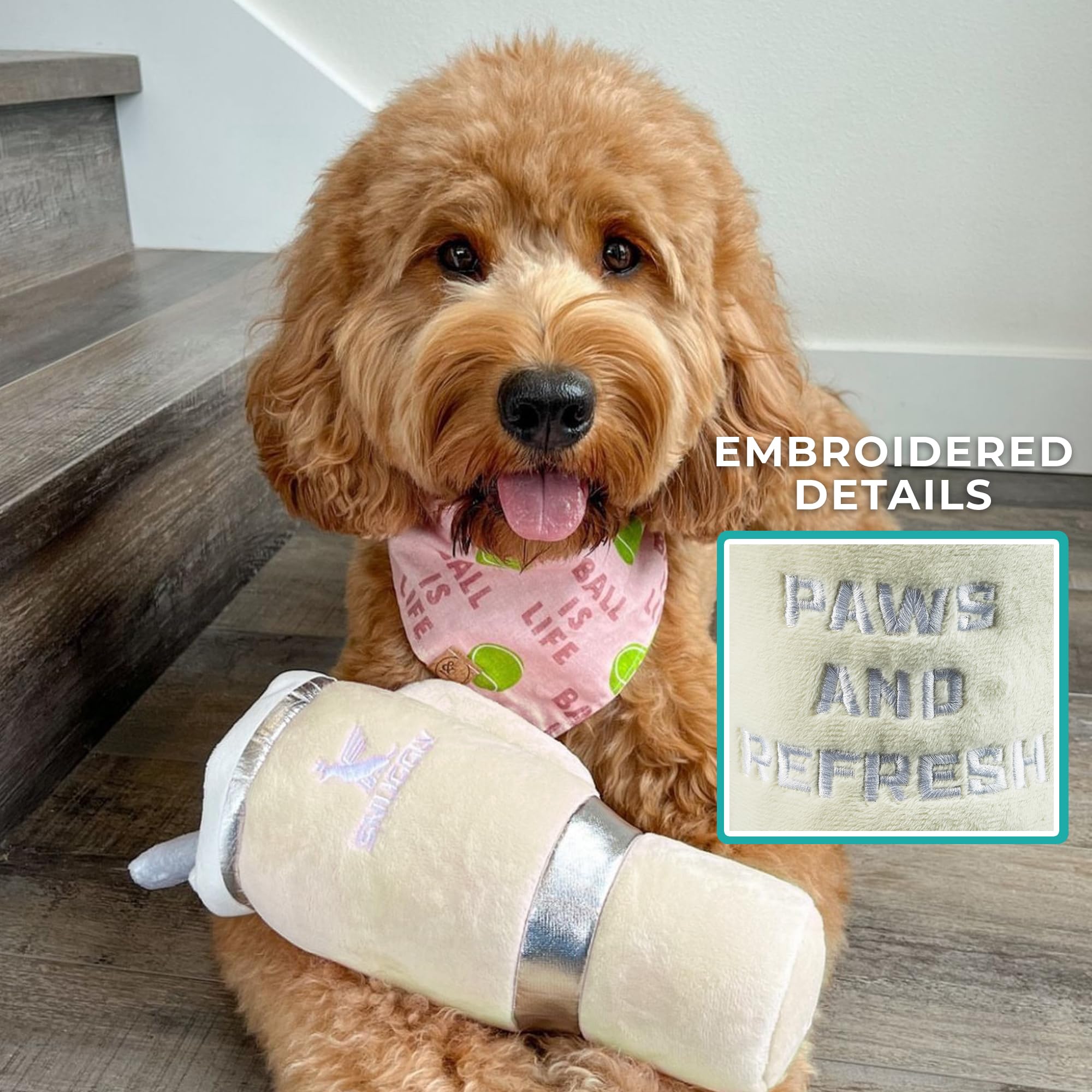 FUNNY PARODY PLUSH DOG TOY: Quench your pup’s playtime thirst with our Snuggly Cup, the iconic tumbler! The back proudly reads “Paws and Refresh”, offering a delightful twist to the classic cup experience. Dog toy dimensions: 10"x6"x2.5".