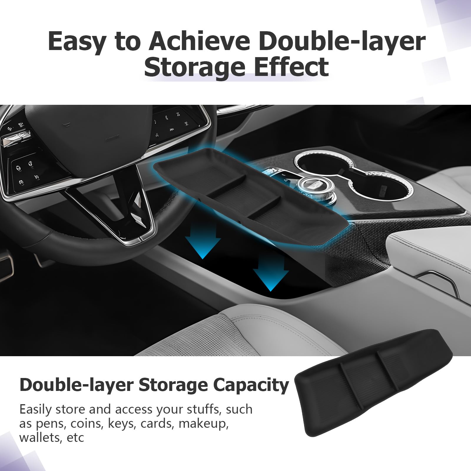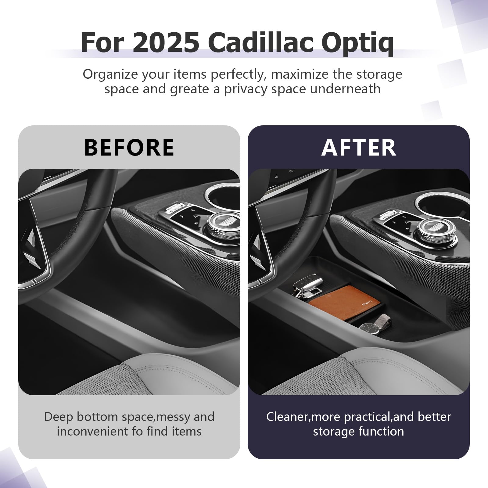 Extra Space — organizer for Cadillac Optiq console,2025 Cadillac Optiq accessories, Cadillac Optiq glove box organizer increase the available space of the center console, you can easily store and access your items, such as pens, coins, keys, wallets, etc., and quickly access items without digging holes. Orderly storage helps your 2025 Cadillac Optiq center console get rid of the messy storage environment