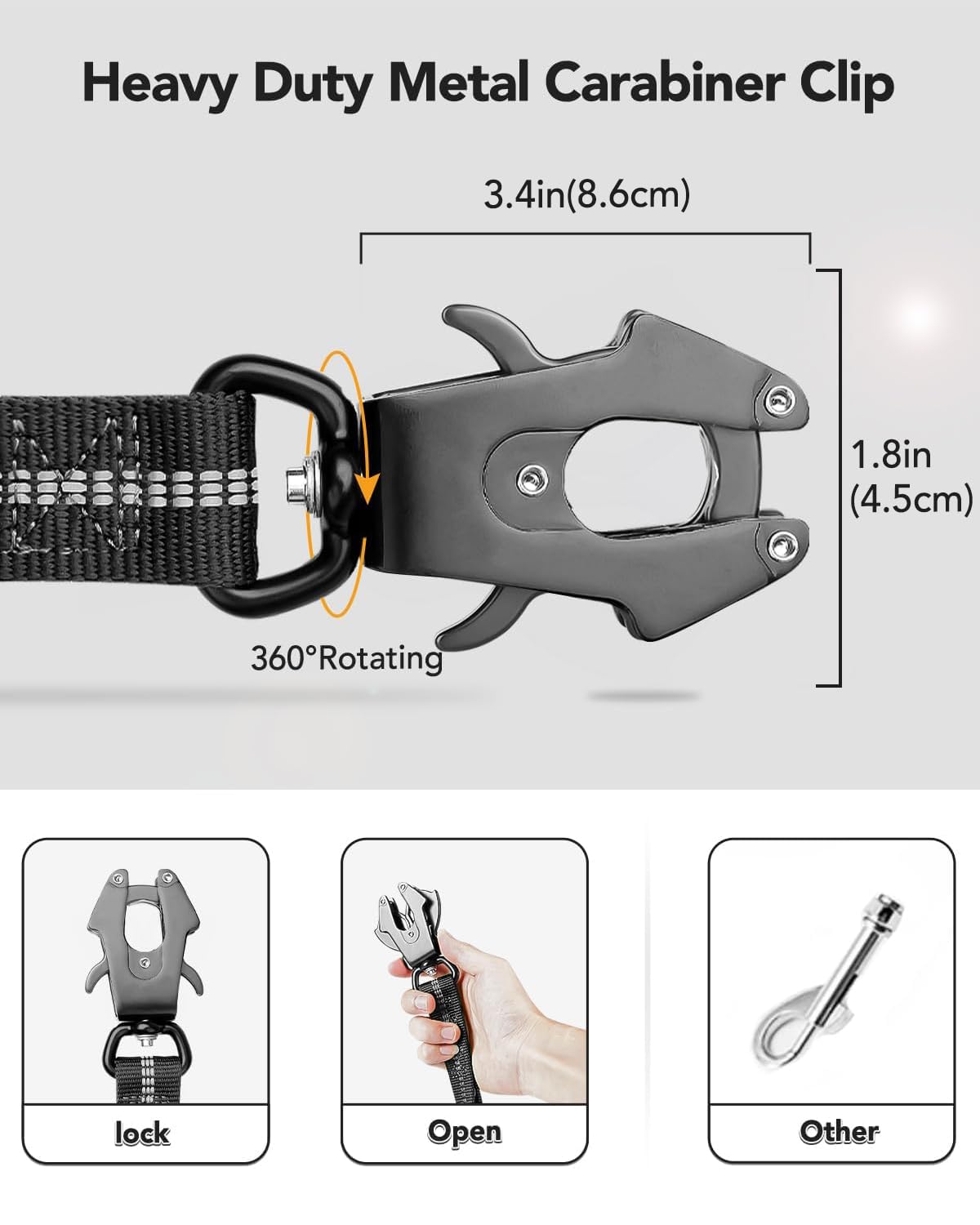 Heavy Duty Frog Clip: The dog leashes for large dogs heavy duty is fitted with a super durable Frog Clip which is made of aviation aluminum alloy. Quick release and locking dog leash buckle while holding tight under strong pull without worrying about it busting open or accidentally opening. 360°rotatable to prevent the dog leash from twisting and knotting