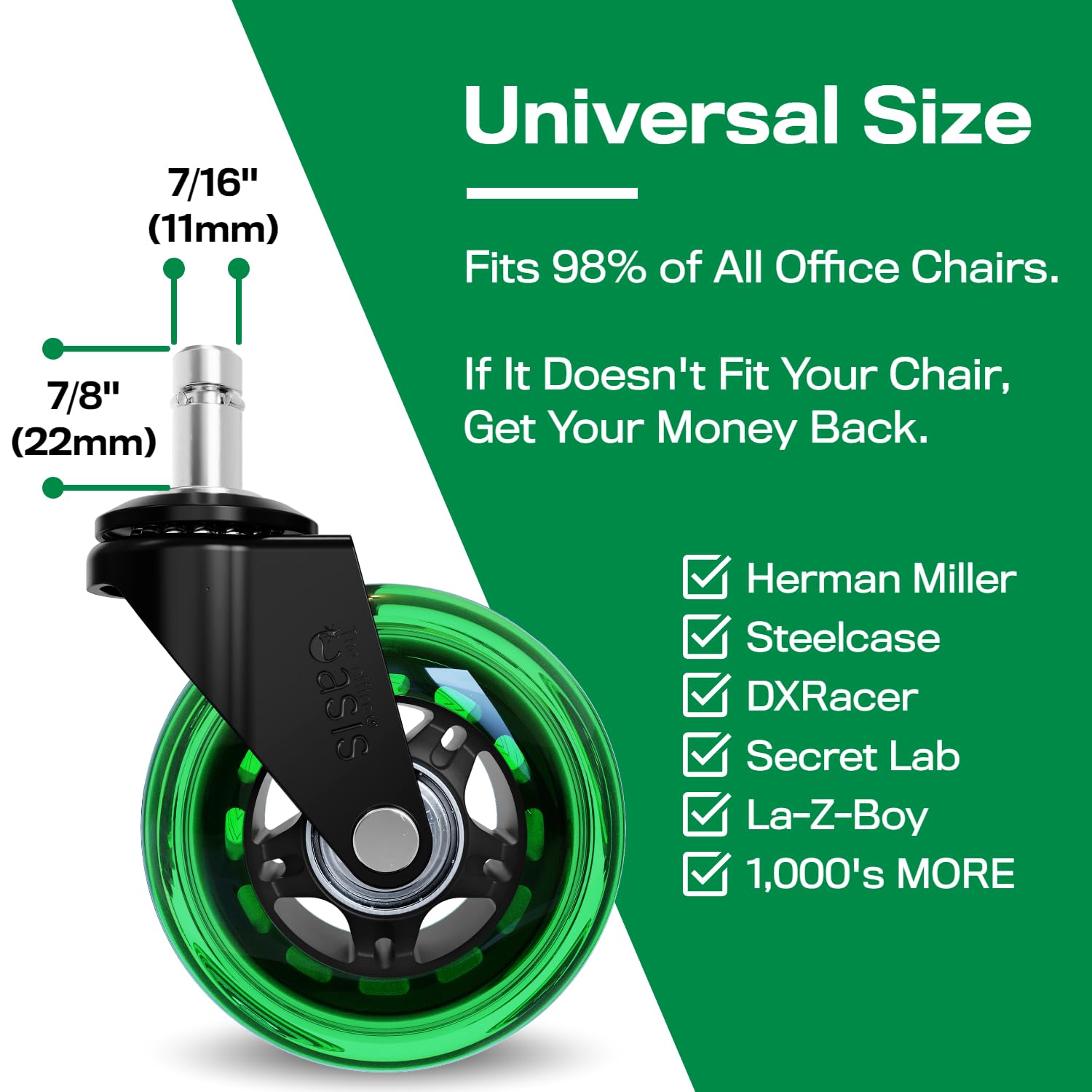 ★ UNIVERSAL SIZE - Upgrade any rolling office chair with these smooth caster wheels. The universal size stem will fit almost every office chair on the market. If for some reason they don’t fit your specific chair, we’ll take care of you.