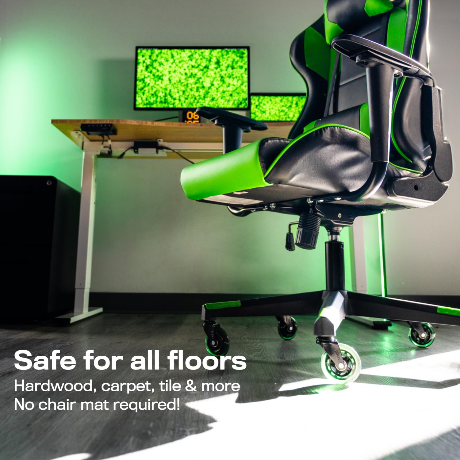 ★ SAFE FOR ALL FLOORS - Many chair wheels use cheap, low quality materials that destroy your flooring. We don't. Encased with soft, polyurethane material our rollerblade style wheels are guaranteed not to scratch or leave marks on any surface (including hardwood, carpet, tile, laminate and more).