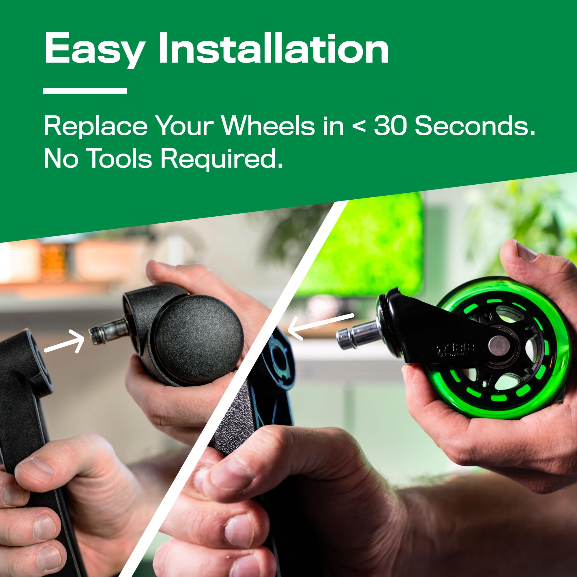 ★ QUICK AND EASY INSTALLATION - No tools required! Easily remove and replace the wheels in your desk chair in less than 30 seconds. Simply pull out your old caster wheels and pop these in. Check out our quick replacement video for more details.