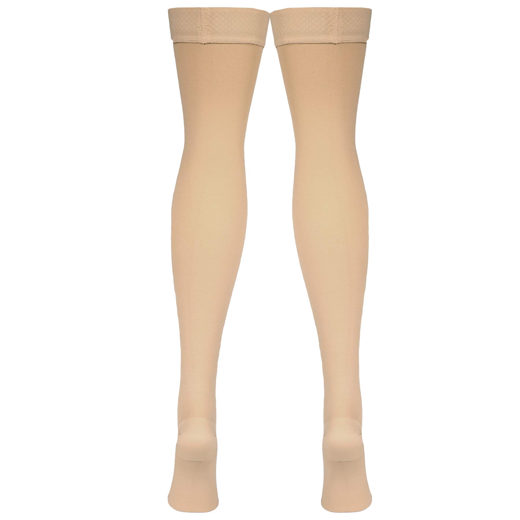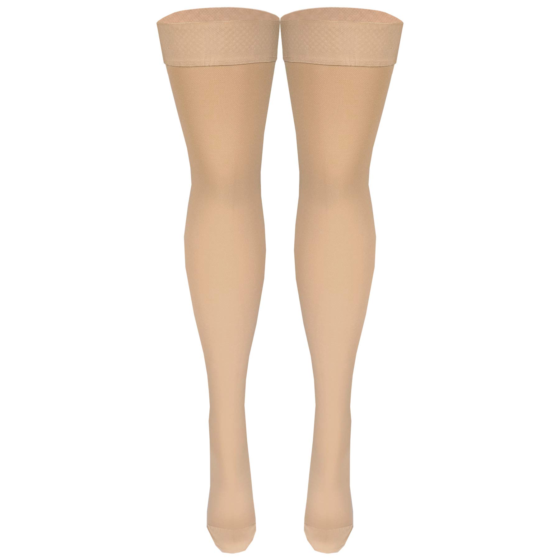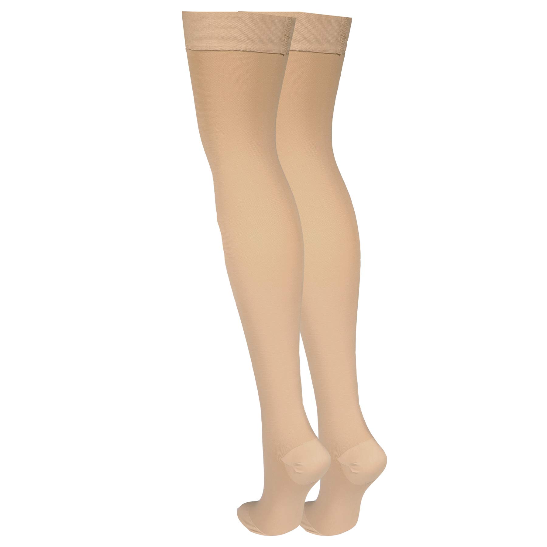 Product Description NuVein thigh length closed-toe medical style compression stockings are made in the USA. Classic unisex fit for Men and Women puts healthy legs first. Therapeutic graduated compression helps restore proper blood flow and circulation. Made to hospital grade standards and suitable for everyday wear, NuVein relieves common vein conditions associated with age, lifestyle, or even just sitting or standing for long periods of time. NuVein hosiery is can be worn by adults of all ages to treat and prevent cardiovascular stress, and helps manage common symptoms like: tired restless legs, aching sore muscles and feet, or heavy feeling in extremities and toes. Rated "Extra Strength" (heavy pressure elasticity) the 20-30 compression level is measured in "mmHg" a unit of pressure, which indicates how tight the garment will feel. A 20-30 mmHg compression level is suggested for patients suffering from: DVT, Edema, Varicose Veins, Sclerotherapy in Lymphatic System, Laser Vein Ablation, Thrombosis, and EVLT Endogenous Radiology. Always confirm the correct compression strength prior to purchase. Increasing compression strength will impact application and feel tighter (if the garment is difficult to apply it does not mean the size is incorrect, most likely, this signals the incorrect level of compression). NuVein medical style hose are knit with a durable opaque fabric that conceals topical bulging veins. Closed toe options have an oversize toe box meant to allow increased movement of toes, and ensure sensitive conditions such as hammer toes, blisters, bruising, bunions and corns are not irritated or compressed together. The ideal use case is users needing a medical product for recovery and optimal circulatory health. Open toe models allow easy toe inspection and permit a standard size to fit a variety of foot length dimensions. Measure when swelling is at a minimum. Sold in pairs. Manufacturer Contact Information Surgical Appliance Industries