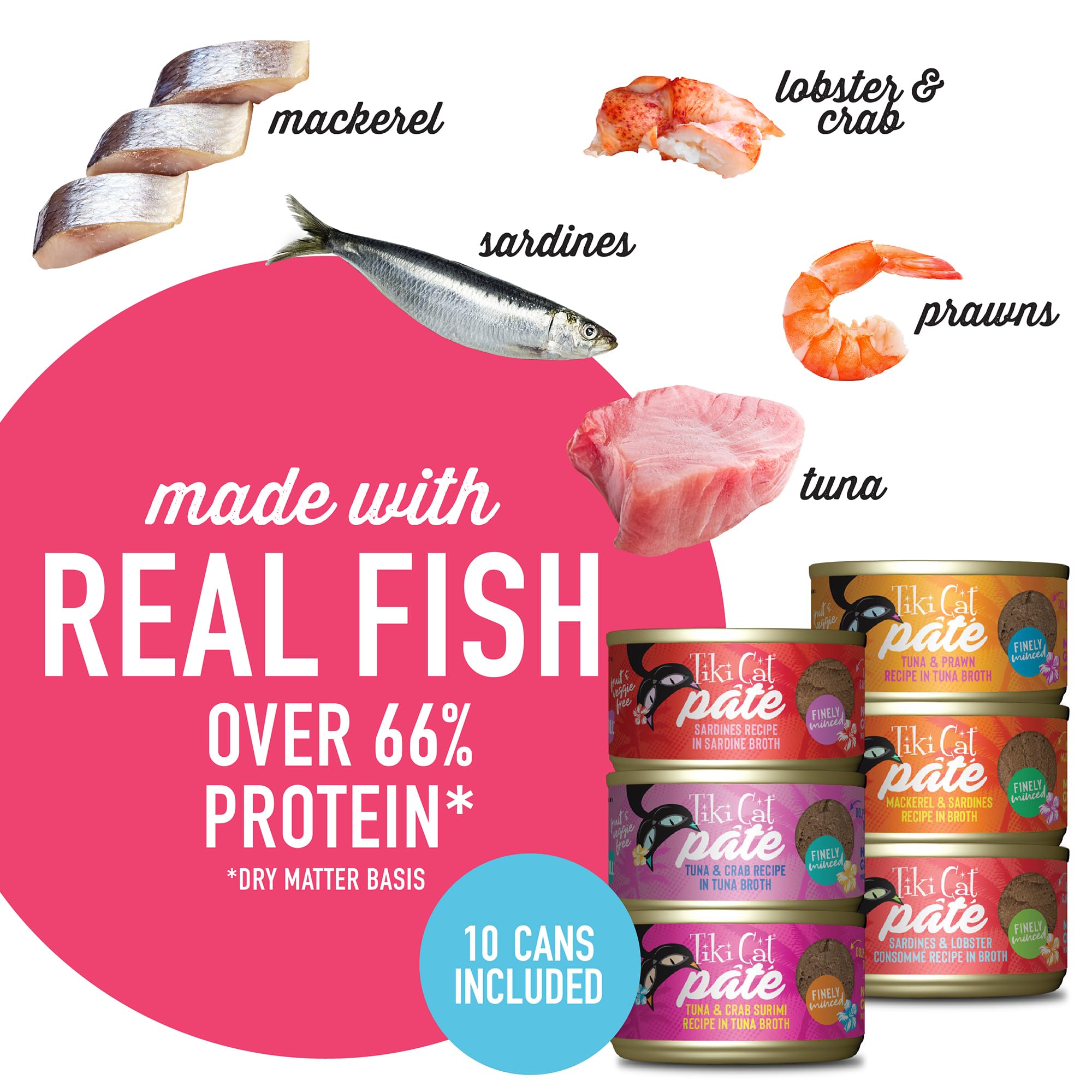 The ultimate feast for your feline! Tiki Cat Grill pates offer the high-protein, high-moisture nutrition cats need as carnivores. Real, flaked sardines, tuna and savory sardine broth are mixed and minced to perfection in the soft pate form cats love. All ingredients are 100% non-GMO, with no fruits or vegetables, grains, artificial colors, flavors or preservatives.