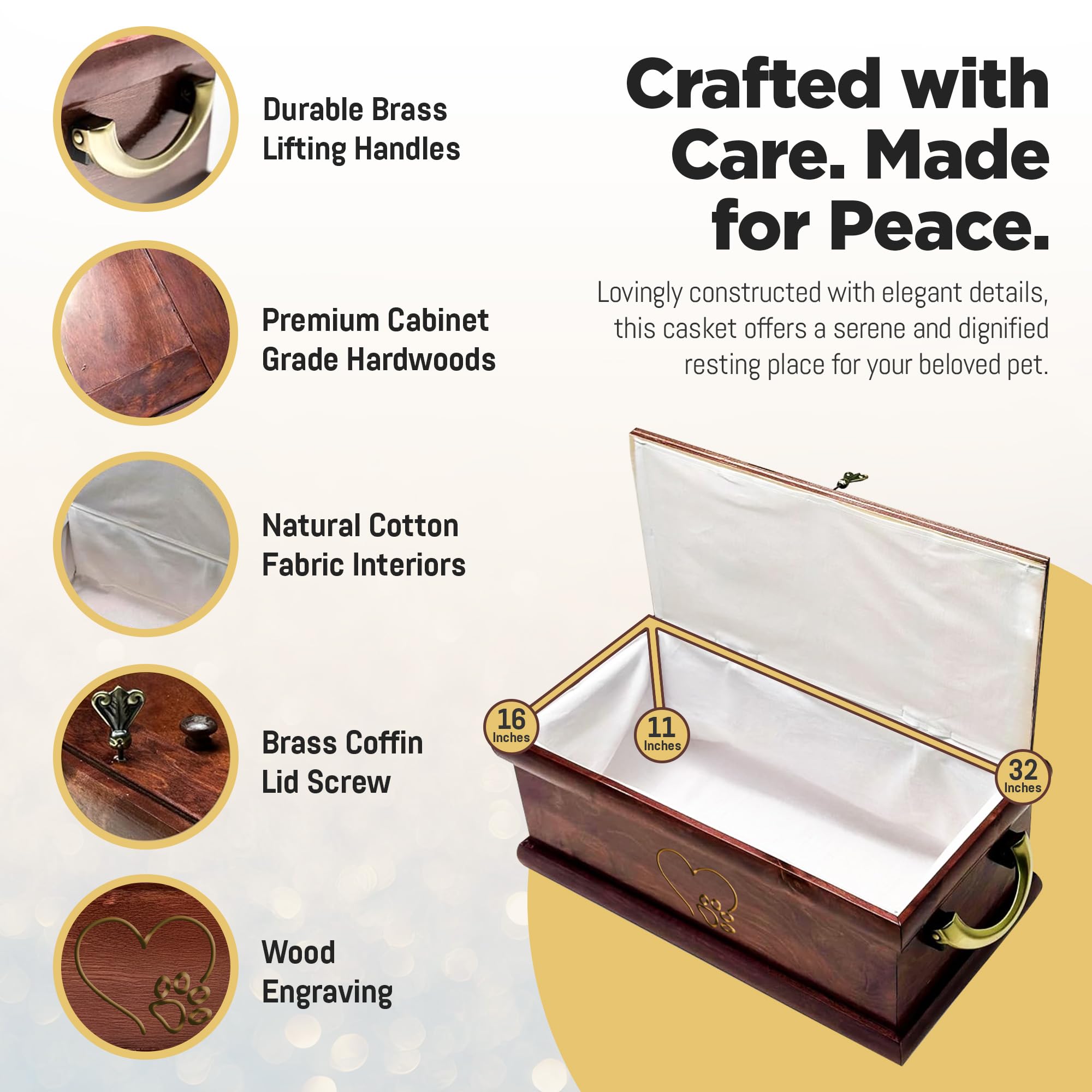 INTERIOR COMFORT AND CARE: Inside, the casket is lined with 100% natural cotton fabric, offering a soft, peaceful, and comfortable environment for your pet’s final resting place. This interior detail ensures that your pet rests gently, surrounded by care and comfort. The cotton lining adds a practical, yet elegant, touch to the casket, making it a perfect blend of beauty and functionality for your furry friend.