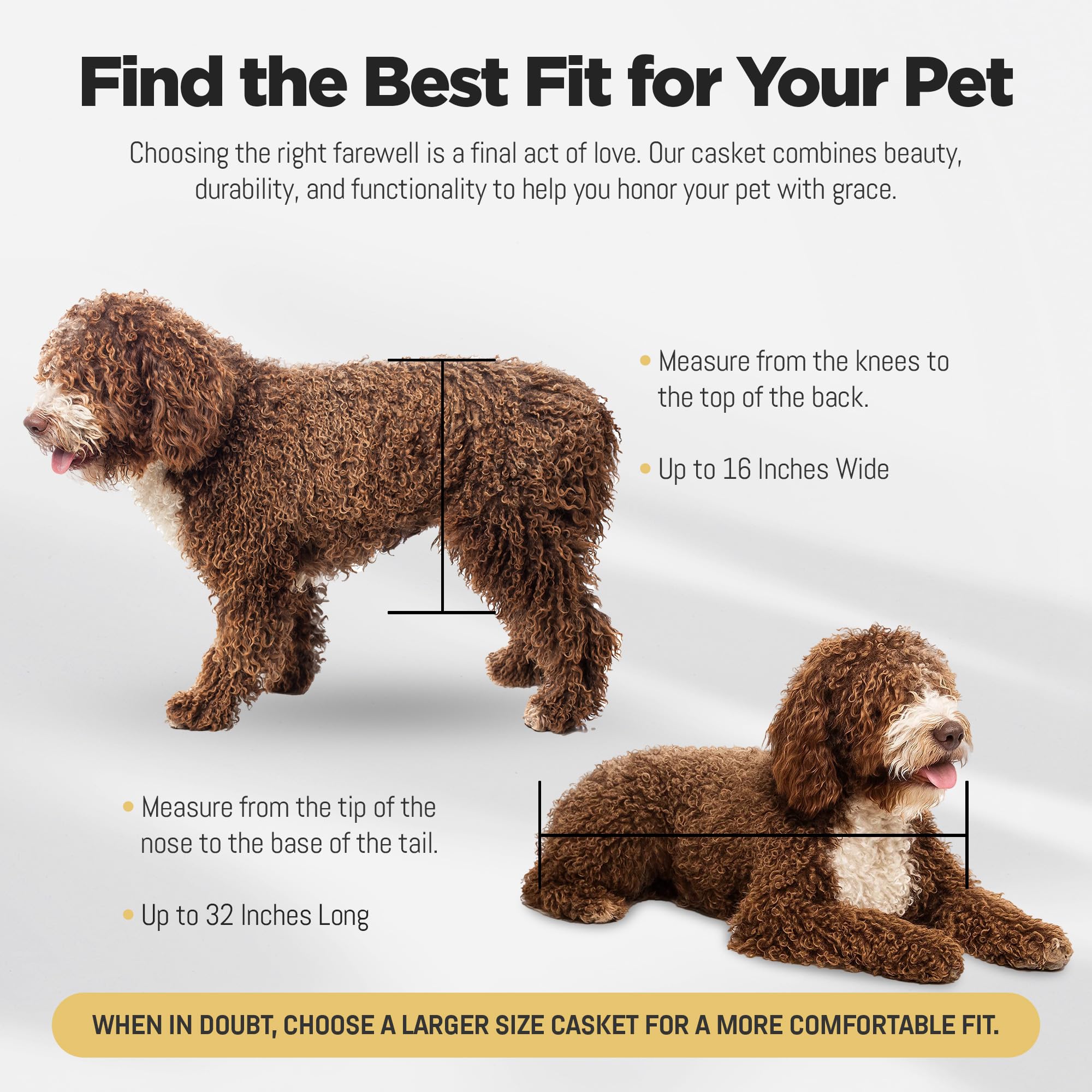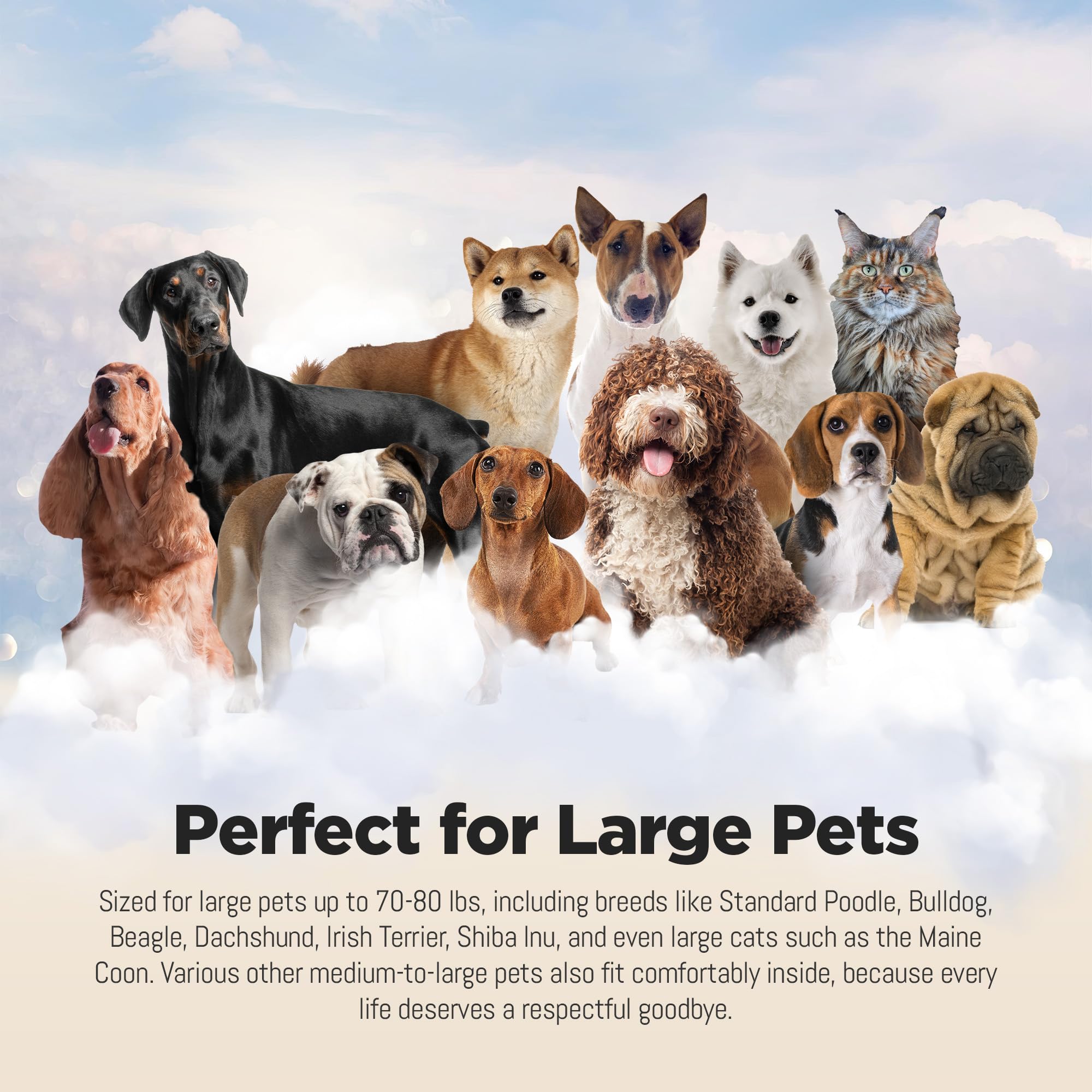 DIMENSIONS AND PET SIZING: With interior dimensions measuring 32” long x 16” wide x 11” deep, this pet casket is suitable for large pets and dogs weighing up to 90 lbs. Breeds like Standard Poodle, Bulldog, Beagle, Dachshund, English Springer Spaniel, and various other pets fit comfortably inside. This casket is designed with ample space for your pet's peaceful journey, ensuring it meets the needs of a wide range of pets, including cats, dogs, and other large animals.